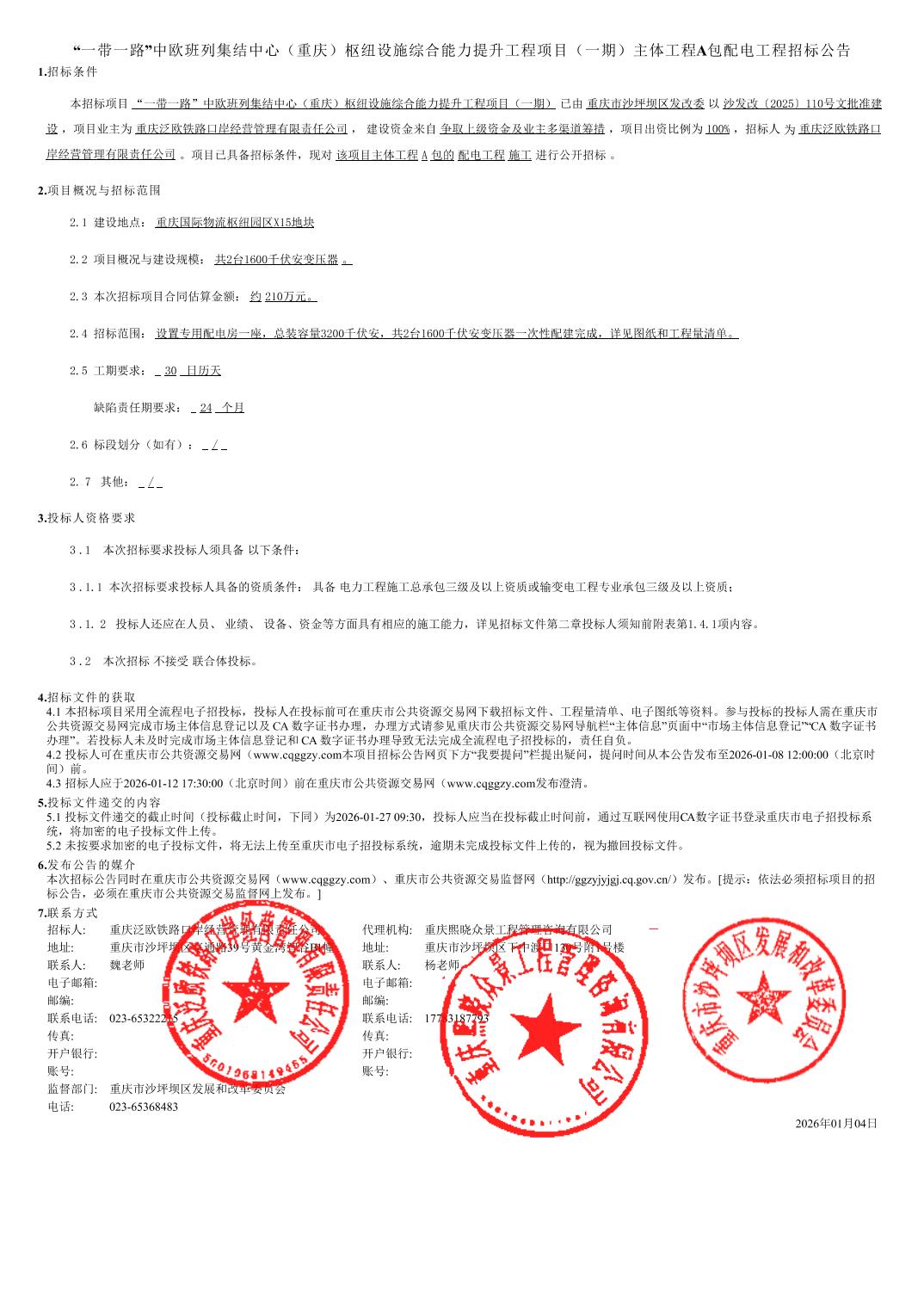 | 名称: | “一带一路”中欧班列集结中心(重庆)枢纽设施综合能力提升工程项目(一期)主体工程*包配电工程招标公告 | ||||