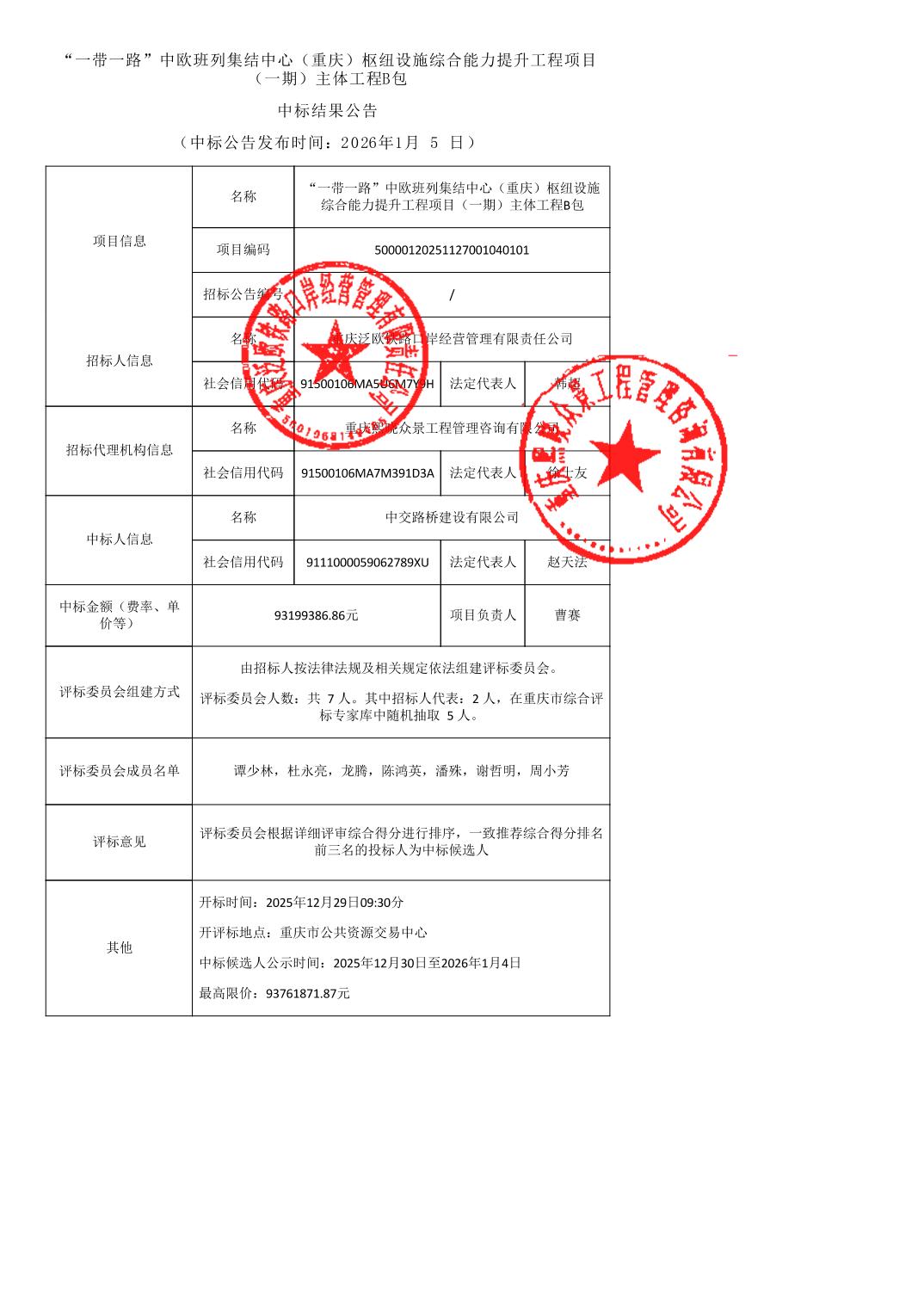 “一带一路”中欧班列集结中心(重庆)枢纽设施综合能力提升工程项目(一期)主体工程B包中标结果公告