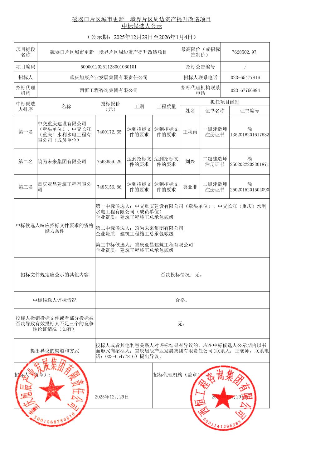 | 名称: | 磁器口片区城市更新—境界片区周边资产提升改造项目中标候选人公示 | ||||