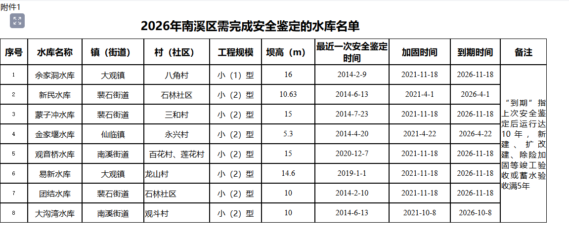 按照水利部《水库大坝安全鉴定办法》《坝高小于**m的小(*)型水库大坝安全鉴定办法(试行)》等有关要求,****年我区安全鉴定到期水库共*座(“到期”指上次安全鉴定后运行达**年,新建、扩改建、除险加固等竣工验收或蓄水验收满*年),按照当年到期、当年完成安全鉴定原则,我区*座水库(详见附件*)均需在****年内完成安全鉴定。