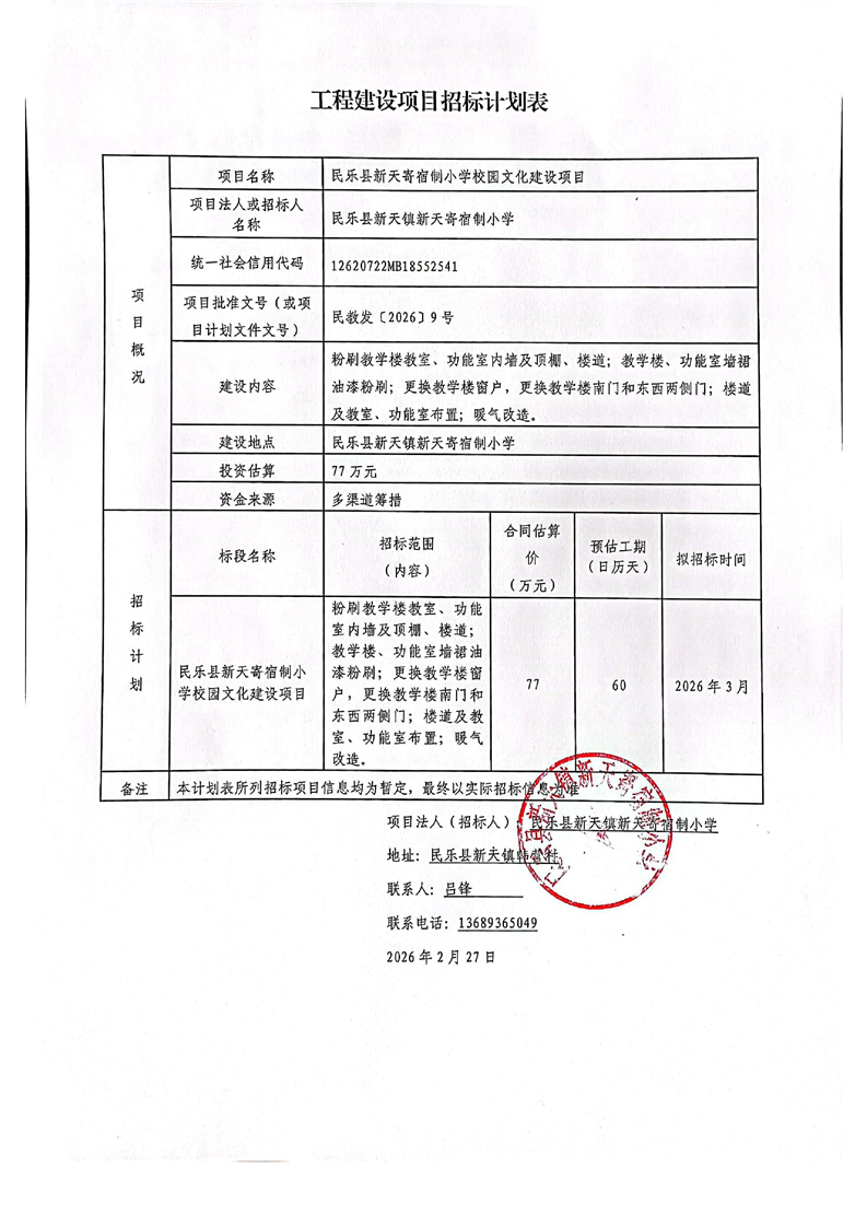 民乐县新天寄宿制小学校园文化建设项目招标计划