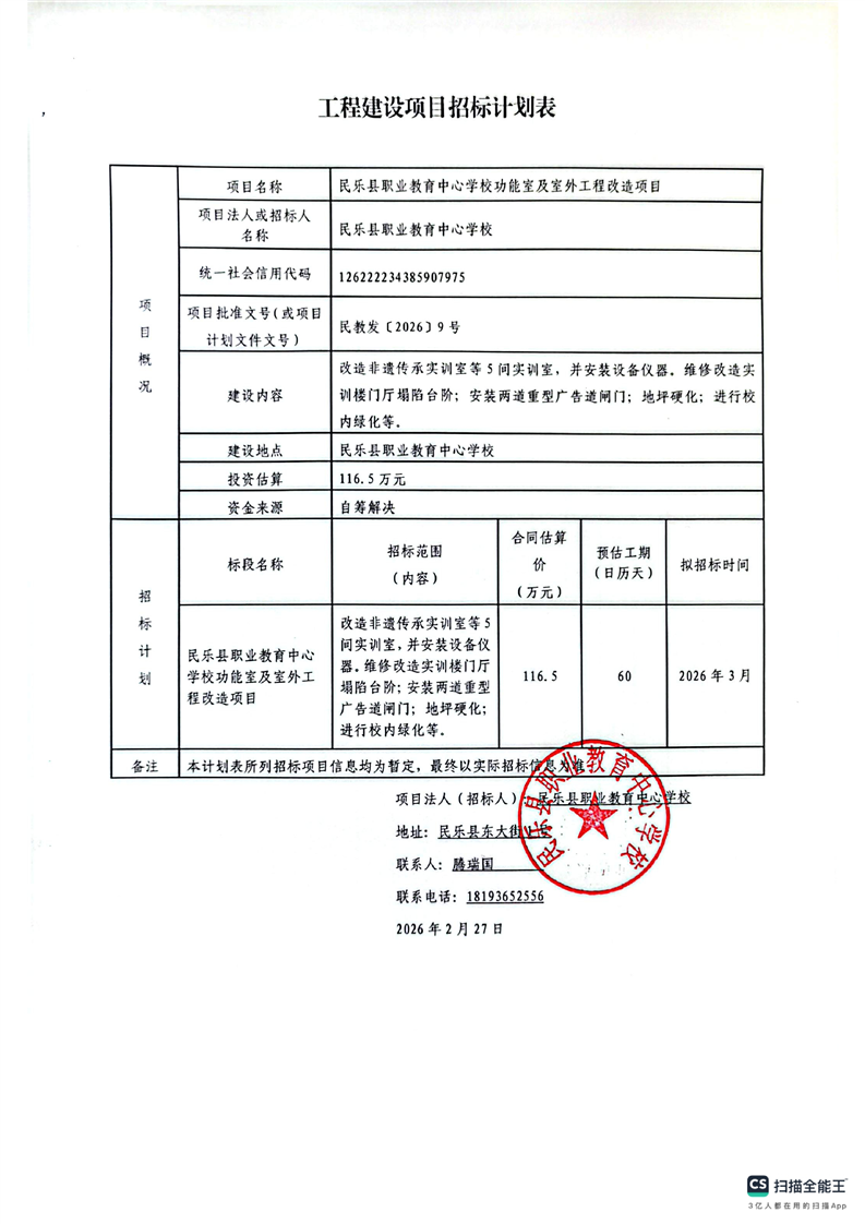 民乐县职业教育中心学校功能室及室外工程改造项目招标计划