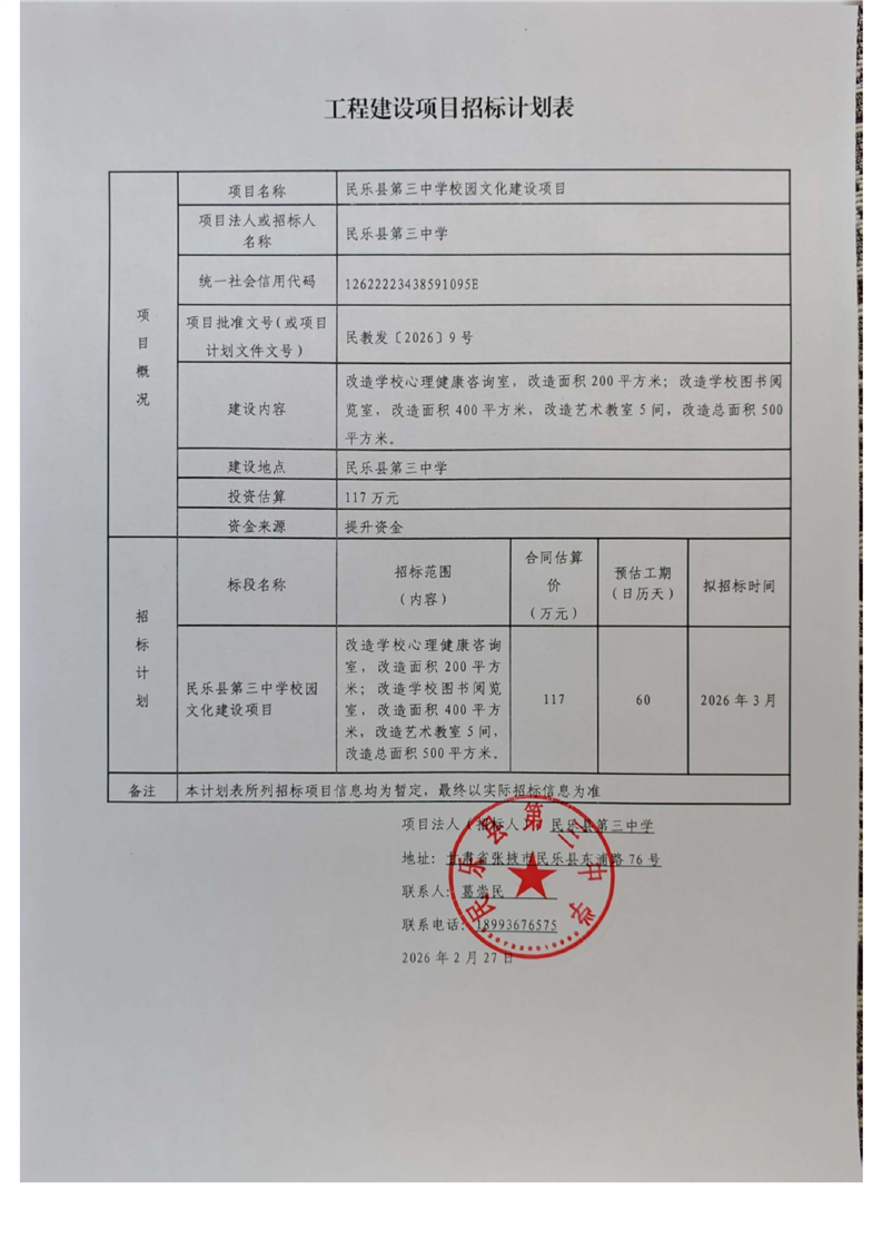 民乐县第三中学校园文化建设项目招标计划