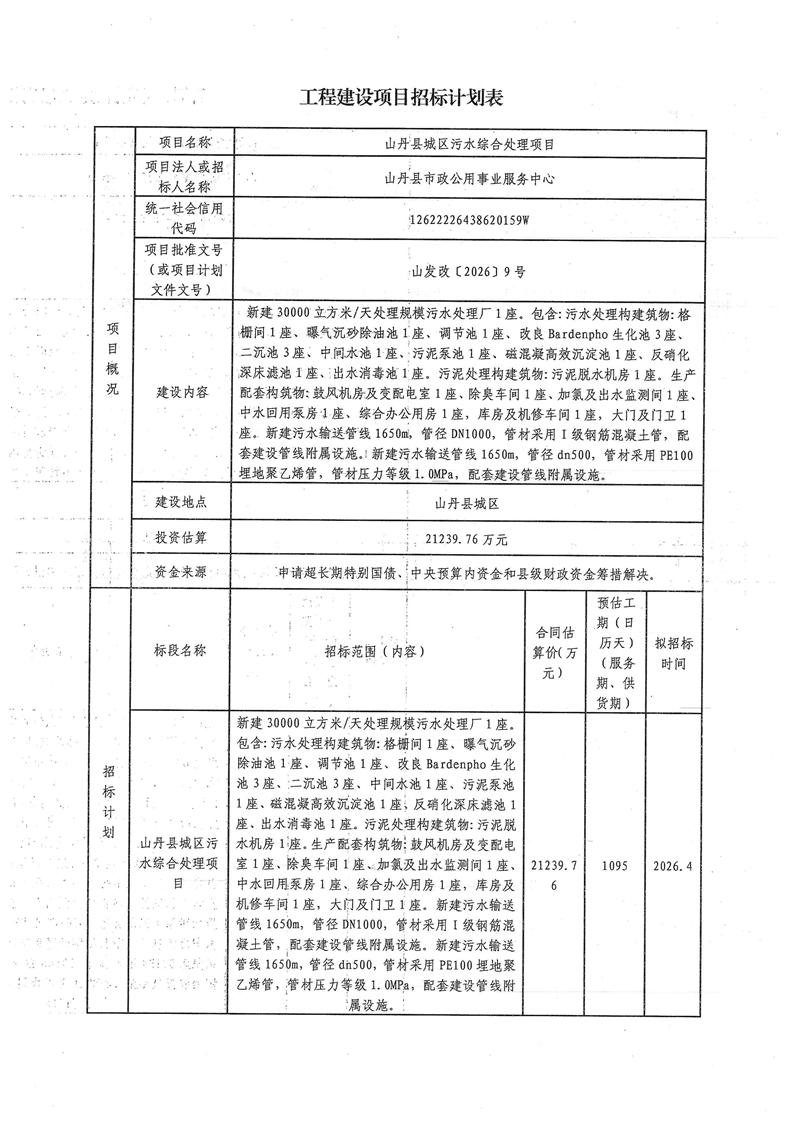 山丹县城区污水综合处理项目招标计划