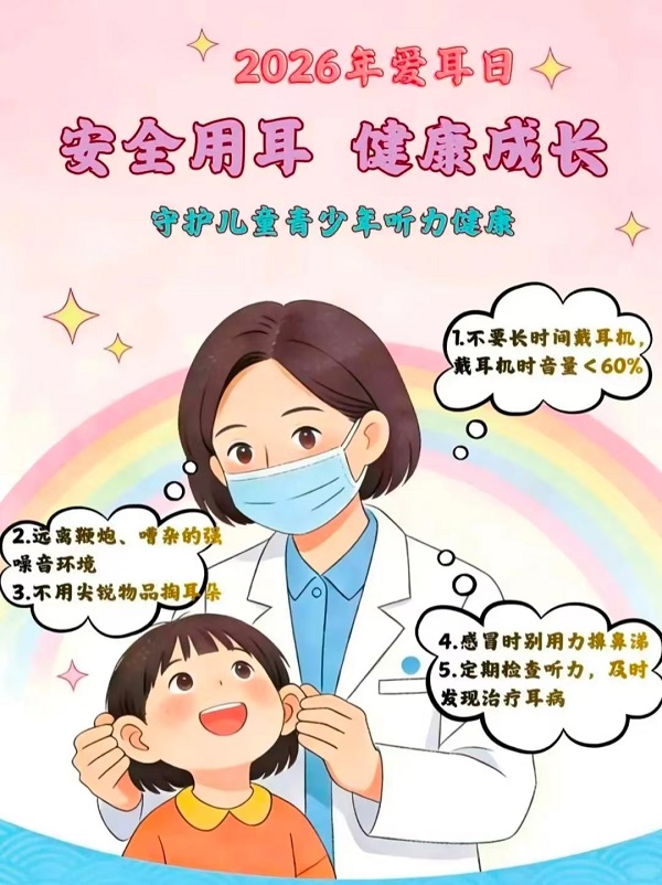 活动时间:*月*日(周二)上午 *:*****:** 活动地点:甘肃医学院附属医院(平凉市人民医院)门诊一楼大厅 活动主题:全民科学爱耳,共护听力健康——安全用耳、健康成长 活动内容:医护人员就各种原因引起的耳聋、中耳炎、耳鸣、眩晕等耳病的诊治进行现场答疑。 耳部疾病早筛知识 *. 哪些人需要立即检查? 经常戴耳机、出入高噪音环境(***、工地)的年轻人。 有高血压、糖尿病史的老年人(听力下降风险高)。 近期有耳闷、耳鸣、眩晕症状者。 儿童说话晚、吐字不清(需警惕听力障碍)。 *. 常见误区 “耳屎是脏东西,必须掏干净?”(错:耵聍有保护作用,频繁掏挖易感染)。 “耳鸣是小事,忍忍就过去了?”(错:可能是突发性耳聋或血管问题的前兆)。 *. 爱耳护耳“三要三不要” 三要: *.要遵循“*****原则”:耳机音量不超过**%,连续使用不超过**分钟。 *.要正确擤鼻涕:按住一侧鼻孔,交替进行,防止鼻涕进入咽鼓管引发中耳炎。 *.要定期检查听力(尤其是**岁以上人群,建议每年一次)。 三不要: *.不要用指甲、棉签或金属挖耳勺过度掏耳朵。 *.不要在嘈杂环境中(如地铁、公交车)大声听歌。 *.不要忽视感冒后的耳闷感(警惕分泌性中耳炎)。 聚焦“全生命周期”听力健康 新生儿:强调听力筛查的重要性(“出生**小时初筛”)。 青少年:娱乐性噪声性耳聋的预防(音乐会、游戏、网课耳机使用)。 中青年:压力大、熬夜导致的突发性耳聋(黄金治疗期:**小时内)。 老年人:关注老人听力,预防老年痴呆,科学验配助听器(“助听器不是买,是配,需要专业调试”)。 让我们共同努力,保护耳朵,聆听精彩世界——甘肃医学院附属医院(平凉市人民医院)耳鼻咽喉科全体医护将和您共同守护听力健康! 耳鼻咽喉科 ****年*月**日