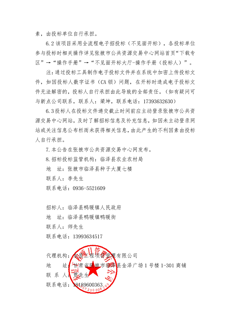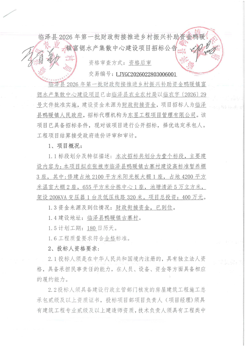 临泽县2026年第一批财政衔接推进乡村振兴补助资金鸭暖镇富锶水产集散中心建设项目[招标/资审公告]