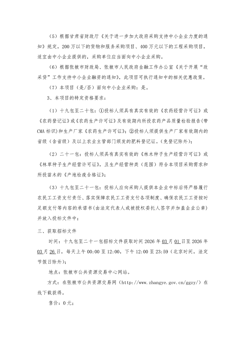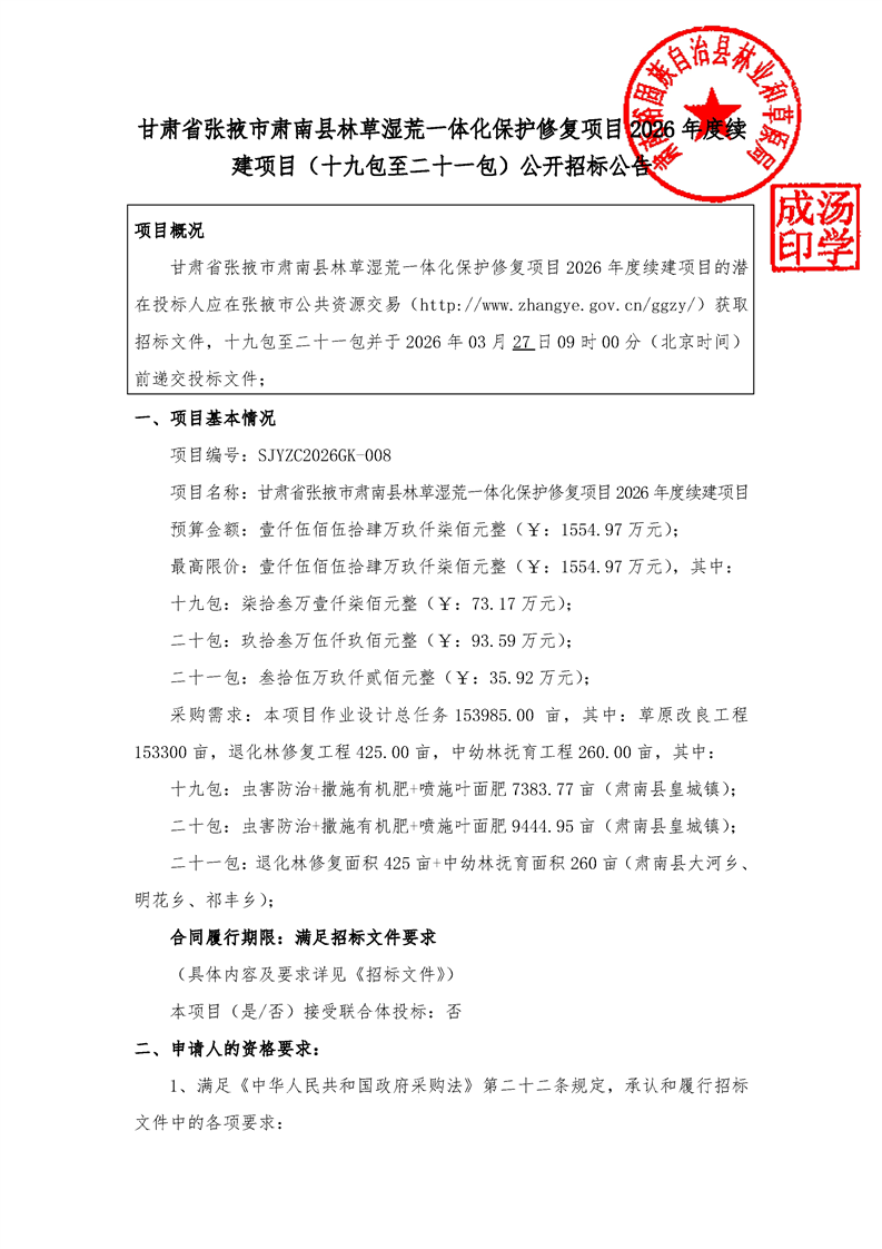 甘肃省张掖市肃南县林草湿荒一体化保护修复项目2026年度续建项目(十九包至二十一包)公开招标公告[采购/资审公告]
