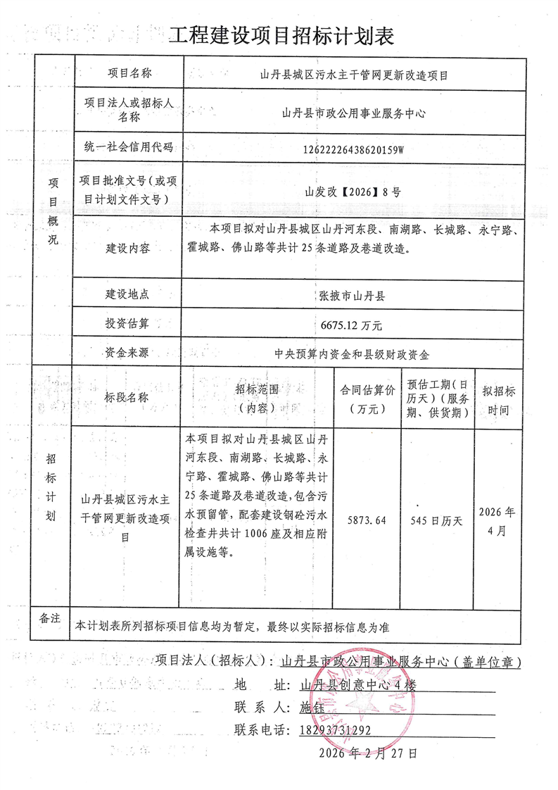 山丹县城区污水主干管网更新改造项目招标计划