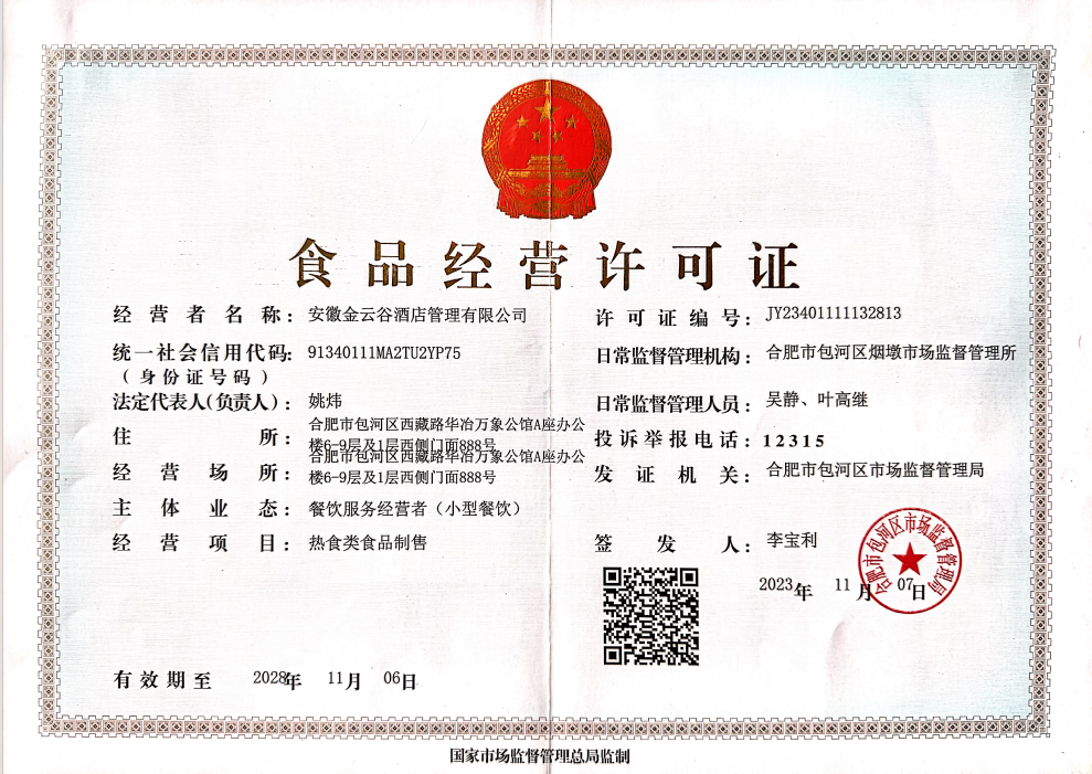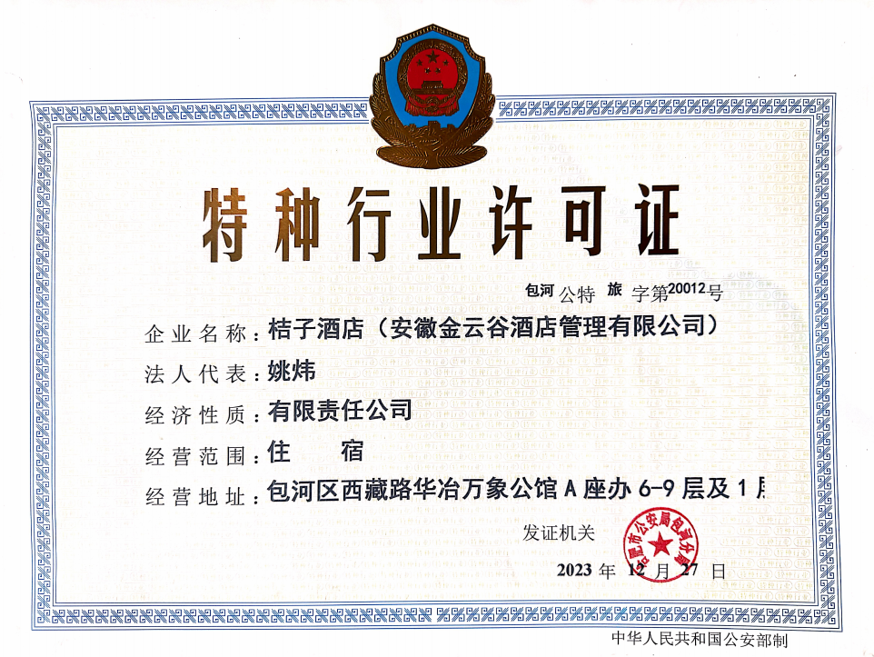 营业场所:安徽省合肥市包河区西藏路与云谷路交口桔子合肥滨湖酒店;酒店地处于滨湖新区云谷路与西藏路交口华冶金谷广场,属于滨湖新区核心金融板块。酒店周边有中,农,工,建,交,浦,发,邮政等各大银行综合服务中心。