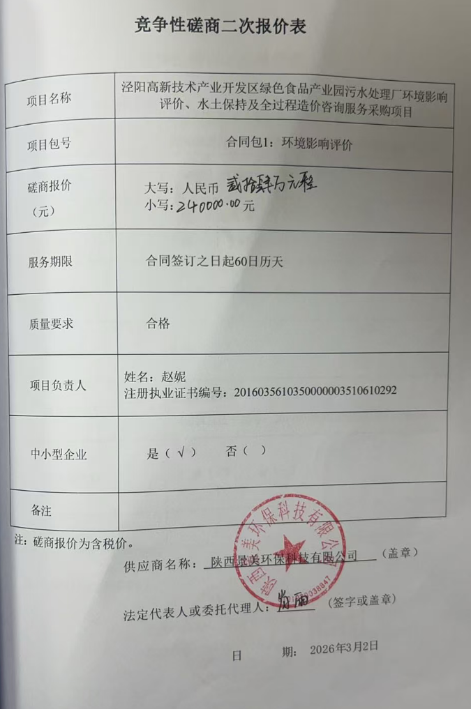 | * | 工程设计前咨询服务 | 泾阳高新技术产业开发区绿色食品产业园污水处理厂环境影响评价 水土保持及全过程造价咨询服务采购项目 | 依照相关法律法规和行业标准,根据污水处理厂可行性研究报告等相关资料,在项目施工前进行环境影响评价,并取得审批部门环评批复文件。 | 符合国家及行业标准要求。 | 合同签订之日起**日历天 | 合格 | ***,***.** |