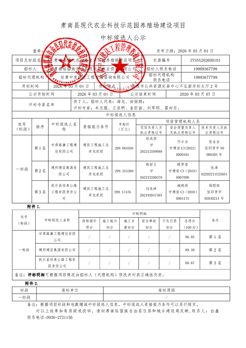 [市本级]肃南县现代农业科技示范园养殖场建设项目中标候选人公示[交易结果公示]