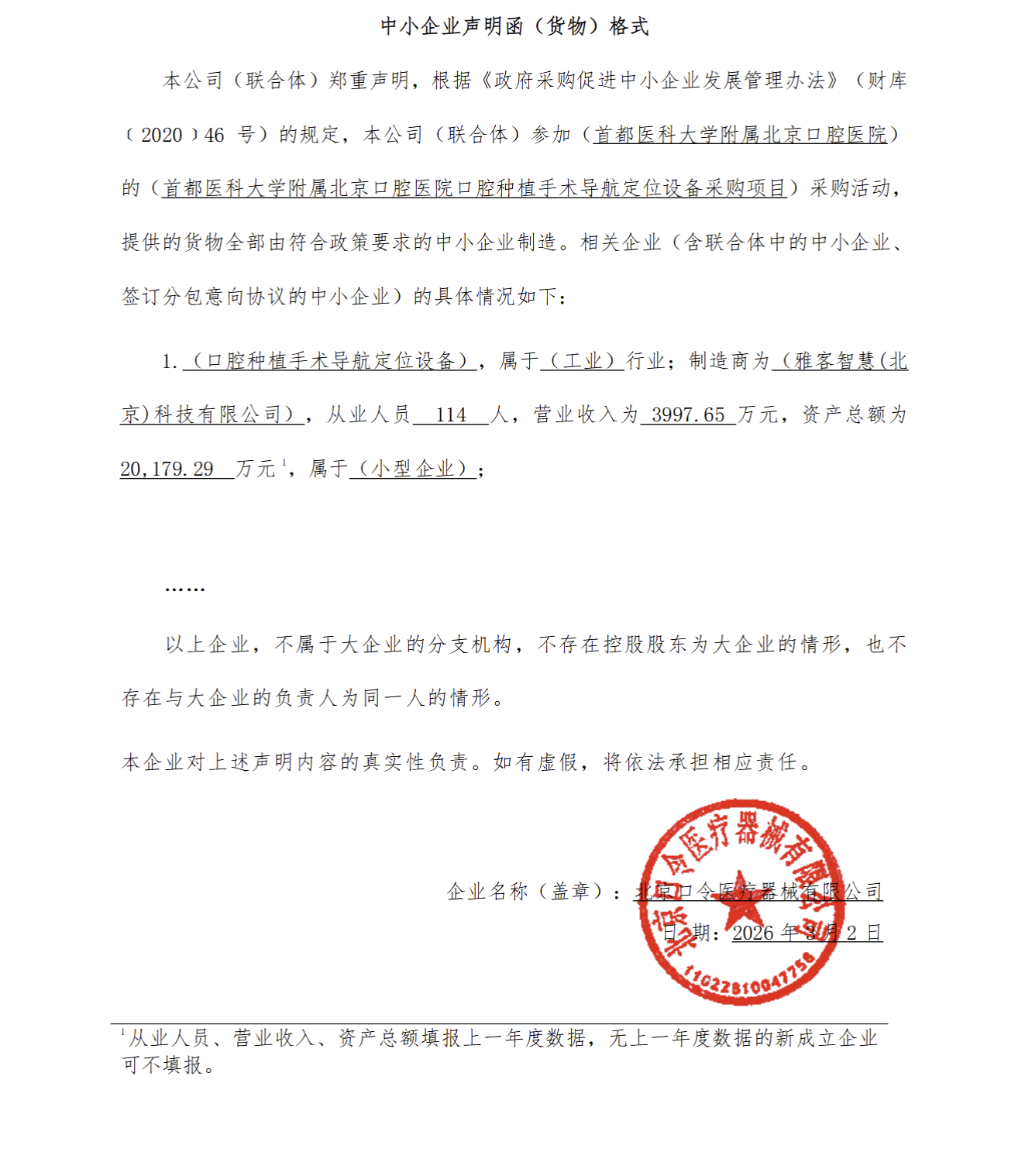 | 北京口令医疗器械有限公司 | 口腔种植手术导航定位设备 | ********** | * | ***.*万元 | ***.*万元 | 详见采购文件 |