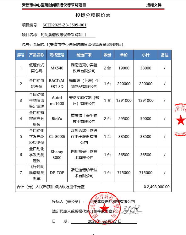 安康市中心医院时间质谱仪等设备采购项目中标结果公告