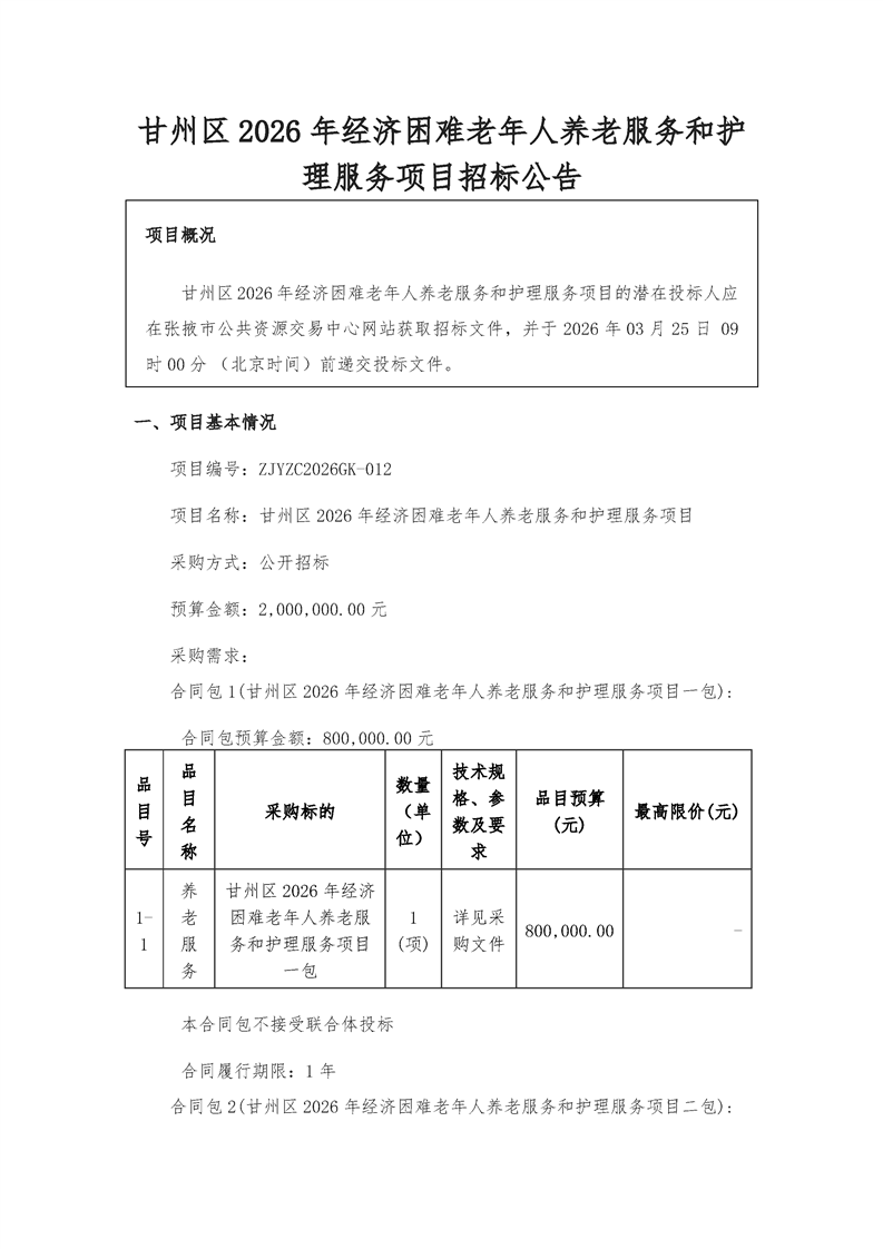 甘州区2026年经济困难老年人养老服务和护理服务项目[采购/资审公告]