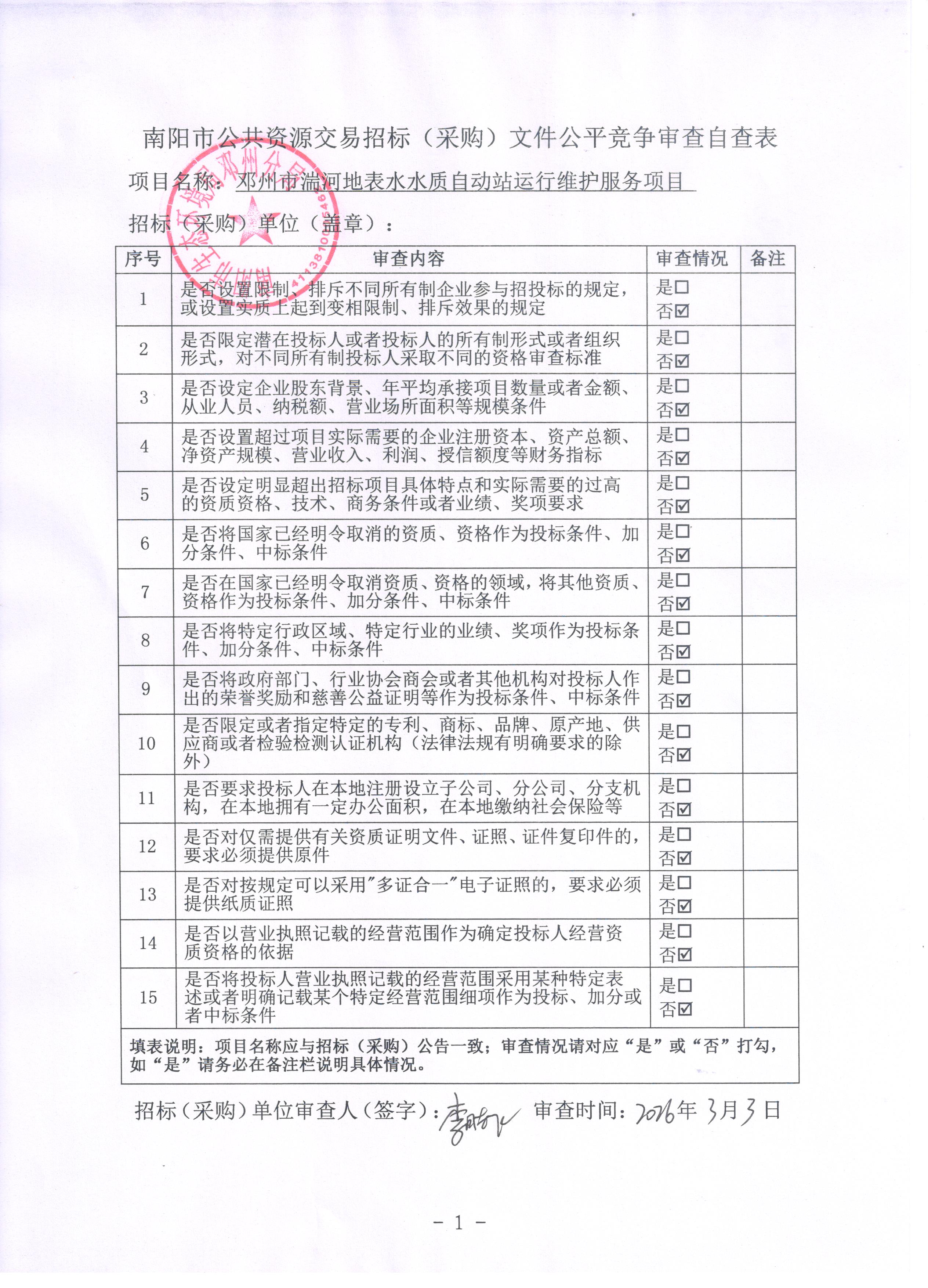| *.*资金来源:财政资金,已落实; *.*标段划分:本项目划分*个标段; *.*采购内容:邓州市湍河地表水水质自动站运行维护(详见采购需求); *.*服务期限:*年; *.*服务质量:符合国家及行业相关标准、规范要求; *.*服务地点:采购人指定地点; | |||||||||||||||