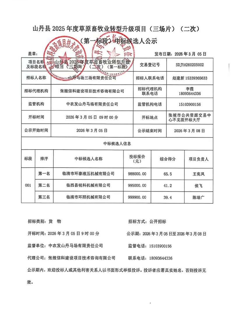 [山丹县]山丹县2025年度草原畜牧业转型升级项目(三场片)(二次)第一标段中标候选人公示[交易结果公示]