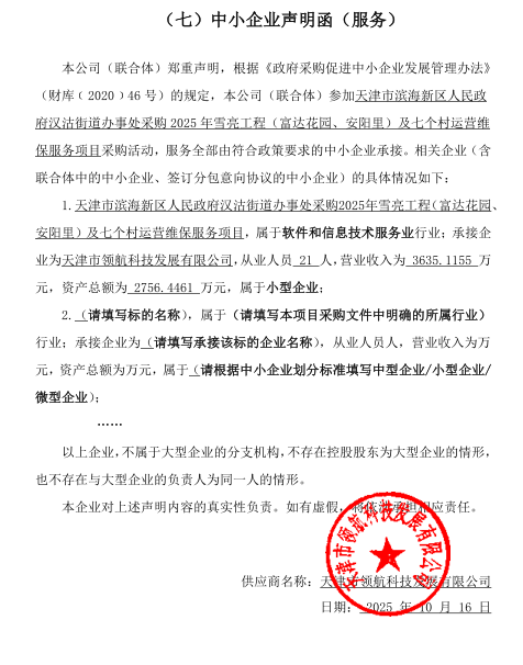 受天津市滨海新区人民政府汉沽街道办事处委托,天津市滨海新区政府采购中心以竞争性磋商方式,对天津市滨海新区人民政府汉沽街道办事处采购****年雪亮工程(富达花园、安阳里)及七个村运营维保服务项目实施采购,现将成交结果公布如下: 一、项目名称和编号 *.项目名称:天津市滨海新区人民政府汉沽街道办事处采购****年雪亮工程(富达花园、安阳里)及七个村运营维保服务项目 *.项目编号:**************** 二、成交信息 *.成交供应商名称:天津市领航科技发展有限公司 *.成交供应商地址:天津市大港区胜利街***号 *.供应商评审报价、评审总得分及排序情况:见附件 *.主要成交标标的名称、规格型号、数量、单价、服务要求或者标的基本概况:服务 三、磋商小组成员名单 张峰、林芳、马永健(采购人代表) 四、项目联系人及联系方式 *.联系人:郭晓萌 *.联系电话:************ 五、采购人的名称、地址和联系方式 *.采购人名称:天津市滨海新区人民政府汉沽街道办事处 *.采购人地址:天津市滨海新区汉沽滨河路**号 *.采购人联系电话:郭超明,************ 六、采购代理机构的名称、地址和联系方式 *.采购代理机构名称:天津市滨海新区政府采购中心 *.采购代理机构地址:天津市滨海新区营口道***号 *.采购代理机构联系方式:************ 七、质疑方式 参与本项目政府采购活动的供应商认为成交结果使自己的合法权益受到损害的,可以在成交结果公告期限届满之日起*个工作日内,以书面形式向采购人天津市滨海新区政府采购中心提出质疑,逾期不予受理。 八、采购人和评审专家推荐意见 无 九、本项目向成交供应商收取服务费*元 成交结果的公告期限为*个工作日。 十一、竞争性磋商文件公告:见附件