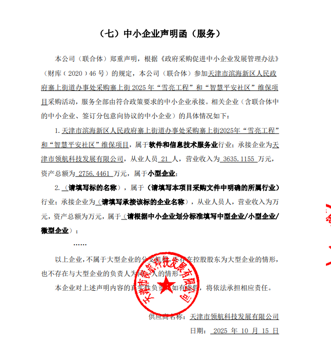 受天津市滨海新区人民政府寨上街道办事处委托,天津市滨海新区政府采购中心以竞争性磋商方式,对天津市滨海新区人民政府寨上街道办事处采购寨上街****年“雪亮工程”和“智慧平安社区”维保项目实施采购,现将成交结果公布如下: 一、项目名称和编号 *.项目名称:天津市滨海新区人民政府寨上街道办事处采购寨上街****年“雪亮工程”和“智慧平安社区”维保项目 *.项目编号:**************** 二、成交信息 *.成交供应商名称:天津市领航科技发展有限公司 *.成交供应商地址:天津市大港区胜利街***号 *.供应商评审报价、评审总得分及排序情况:见附件 *.主要成交标标的名称、规格型号、数量、单价、服务要求或者标的基本概况:见附件 三、磋商小组成员名单 马丽丽、王波、宋立宁(采购人代表) 四、项目联系人及联系方式 *.联系人:夏冰 *.联系电话:************ 五、采购人的名称、地址和联系方式 *.采购人名称:天津市滨海新区人民政府寨上街道办事处 *.采购人地址:天津市滨海新区人民路*号 *.采购人联系电话:杨琪 ************ 六、采购代理机构的名称、地址和联系方式 *.采购代理机构名称:天津市滨海新区政府采购中心 *.采购代理机构地址:天津市滨海新区营口道***号 *.采购代理机构联系方式:************ 七、质疑方式 参与本项目政府采购活动的供应商认为成交结果使自己的合法权益受到损害的,可以在成交结果公告期限届满之日起*个工作日内,以书面形式向采购人天津市滨海新区政府采购中心提出质疑,逾期不予受理。 八、本项目不向成交供应商收取服务费。 九、成交结果公告期限 成交结果的公告期限为*个工作日。 十、竞争性磋商文件公告:见附件