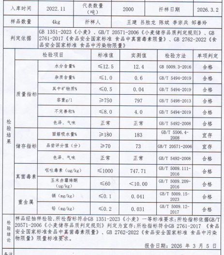 *.质量要求:(*)采购****年产小麦,供货方对原粮产地和生产年份的真实性负责并提供产地证明。入库小麦需同一产地。(*)质量指标符合《***********》国家标准三级及以上,符合国家食品安全标准,符合《**/***********》小麦储存品质判定规则。其中:①水分≤**.*%,水分>**.*%拒收,超出部分每超*.*%,扣量*.**%。②容重≥****/*,容重<****/*拒收。③杂质≤*.*%,小麦经买方整理过筛达标后入仓,整理筛下物随车返还,由卖方处置;不完善粒≤*.*%,>*.*%拒收。④脱氧雪腐镰刀菌烯醇≤******/**、玉米赤霉烯酮毒素≤****/**,⑤重金属镉(**)≤*.****/**,重金属铅(**)≤*.****/**,上述*项指标任意一项超标拒收,拒收虫粮、陈粮及新陈互混的小麦。色泽气味正常。符合《四川省地方储备粮出入库必检项目》(川粮局函[****]**号)文件要求。以上任何一项指标不合格,均作退货处理,产生的一切费用均由卖方自行承担。