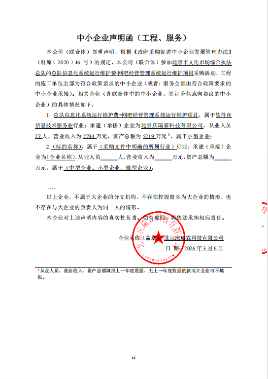 | 北京庆瑞霖科技有限公司 | * | ***.**万元 | ***.**万元 | 对网吧经营管理系统开展巡检、例行维护与故障排除、数据备份、网吧平台维护等运维服务,并开展国产化适配工作,保障网吧经营管理系统安全稳定运行 |