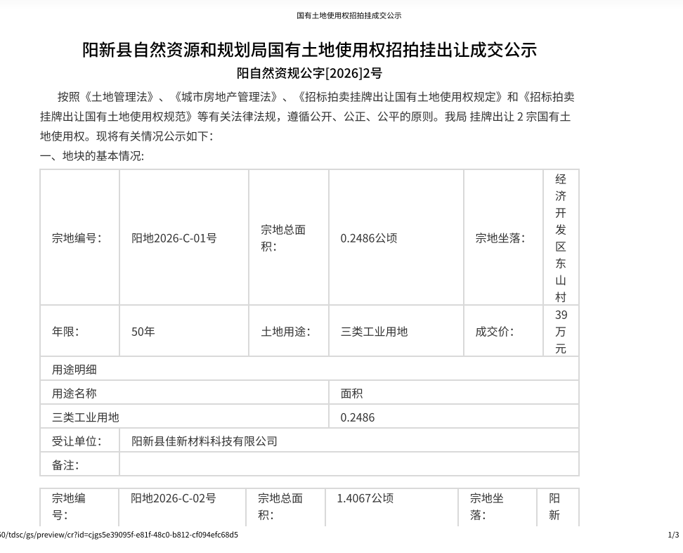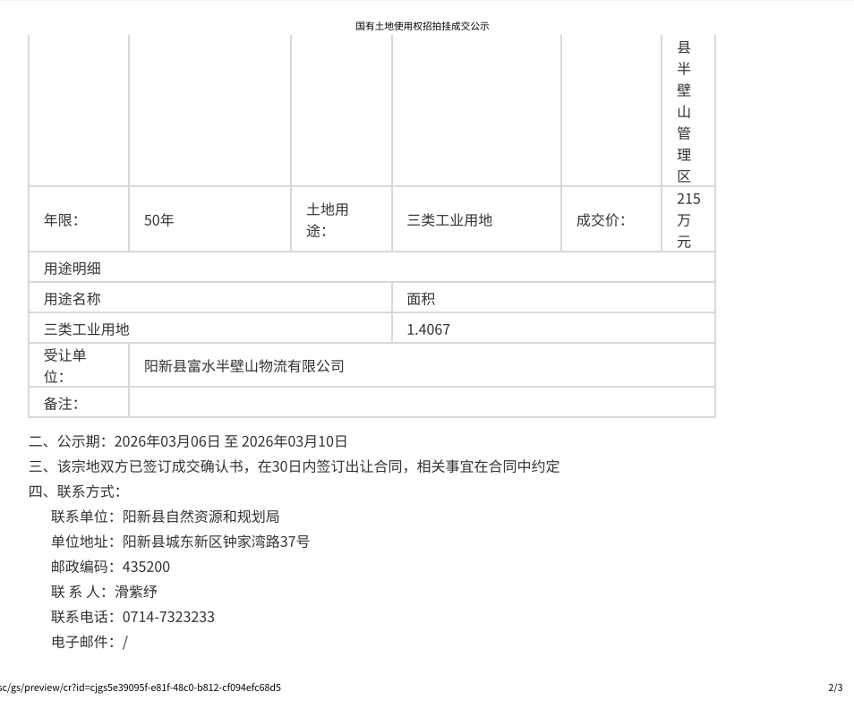 阳新县自然资源和规划局国有土地使用权招拍挂出让成交公示 阳自然资规公字【2026】2号