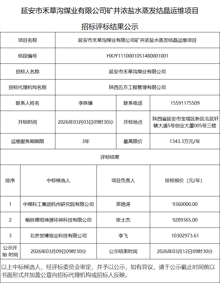 延安市禾草沟煤业有限公司矿井浓盐水蒸发结晶运维项目中标候选人公示