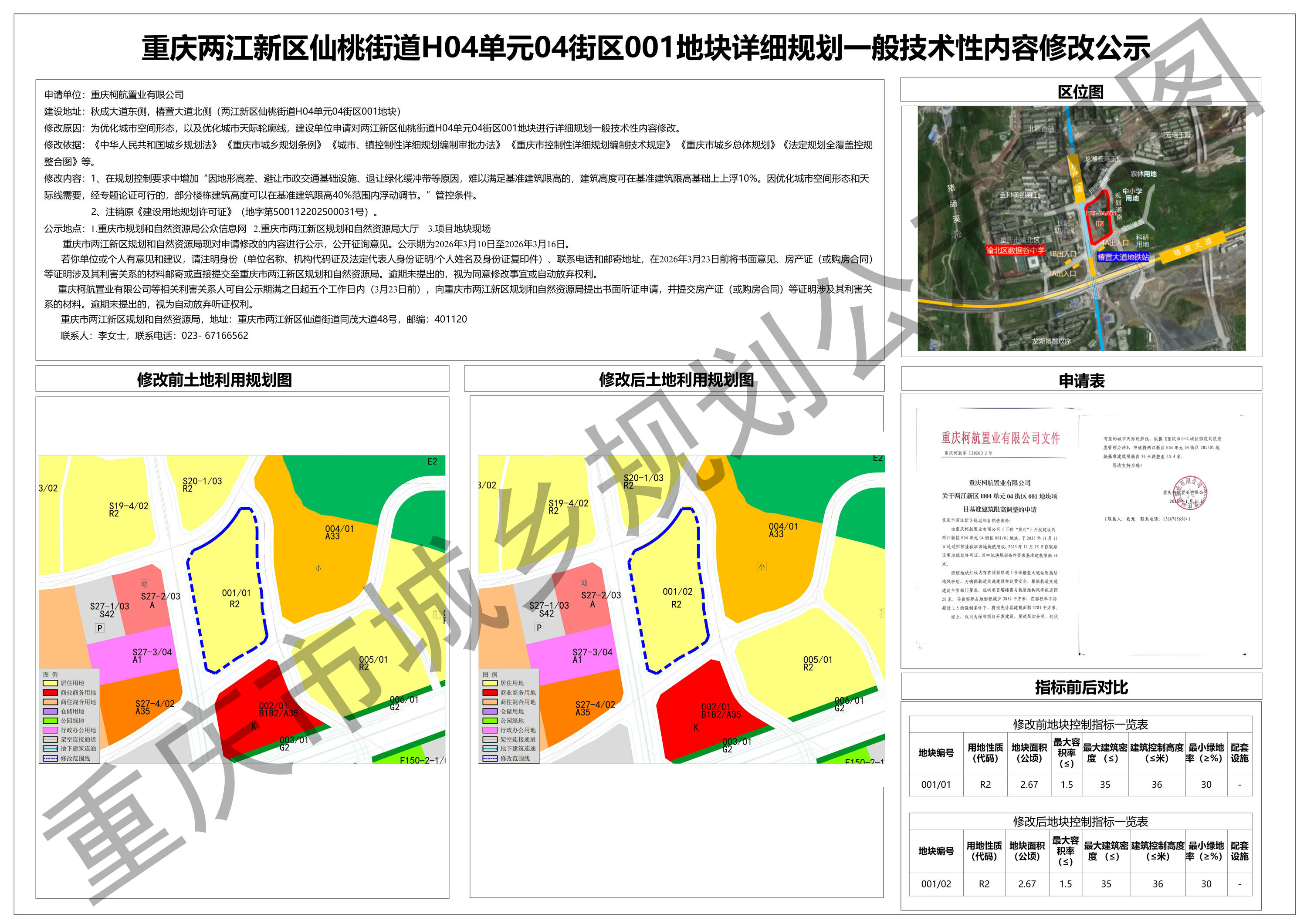 重庆两江新区仙桃街道H04单元04街区001地块详细规划一般技术性内容修改公示