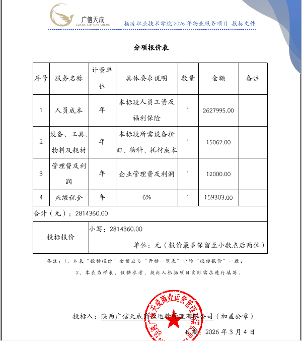 杨凌职业技术学院2026年物业服务项目中标(成交)结果公告
