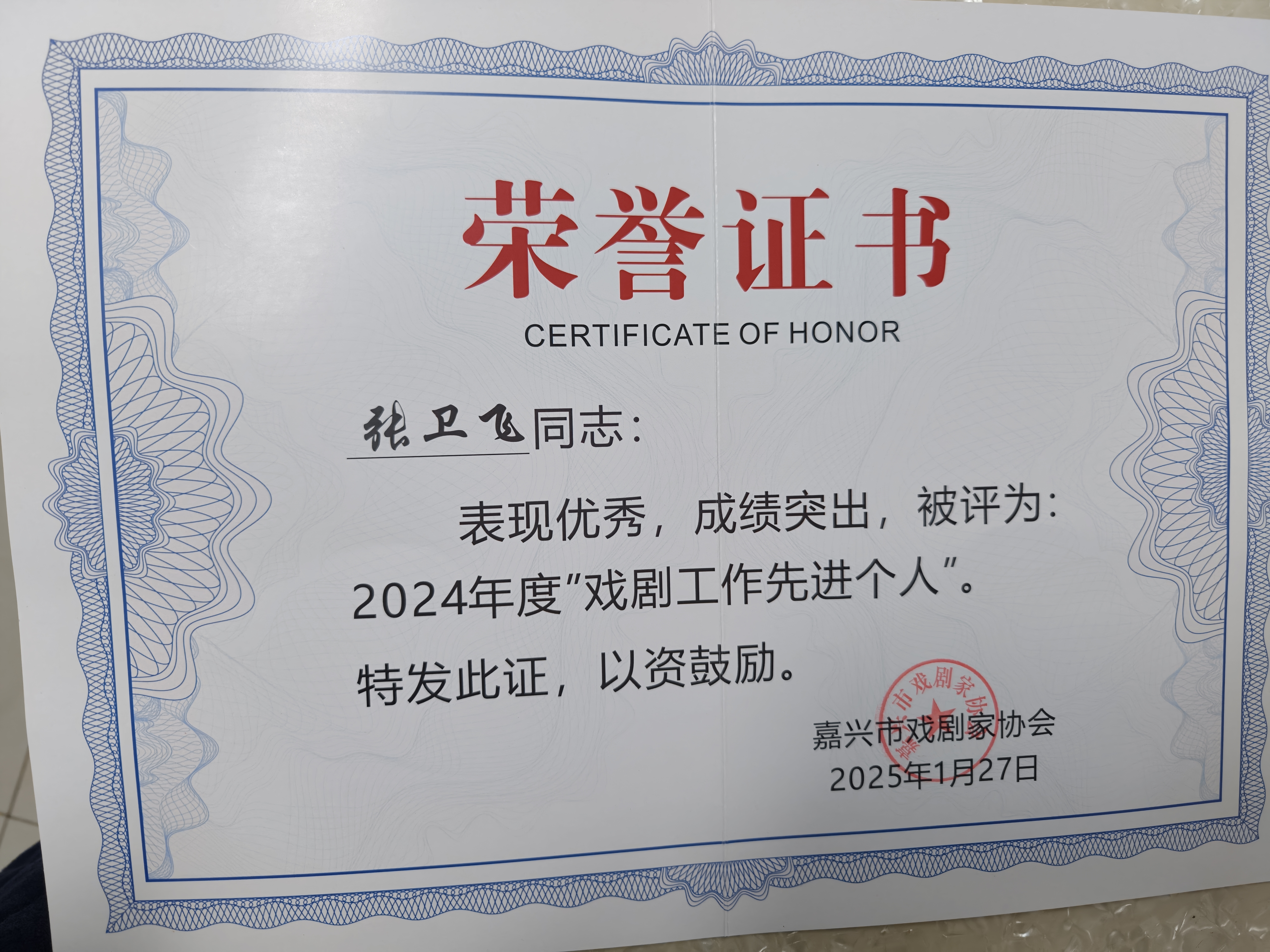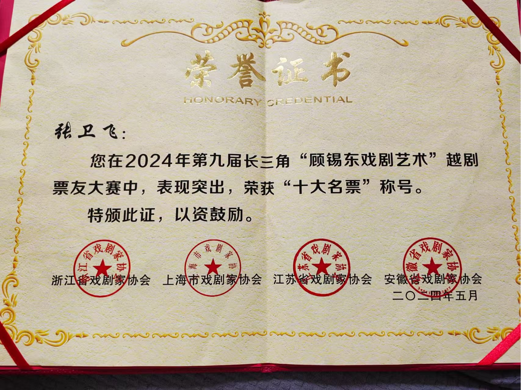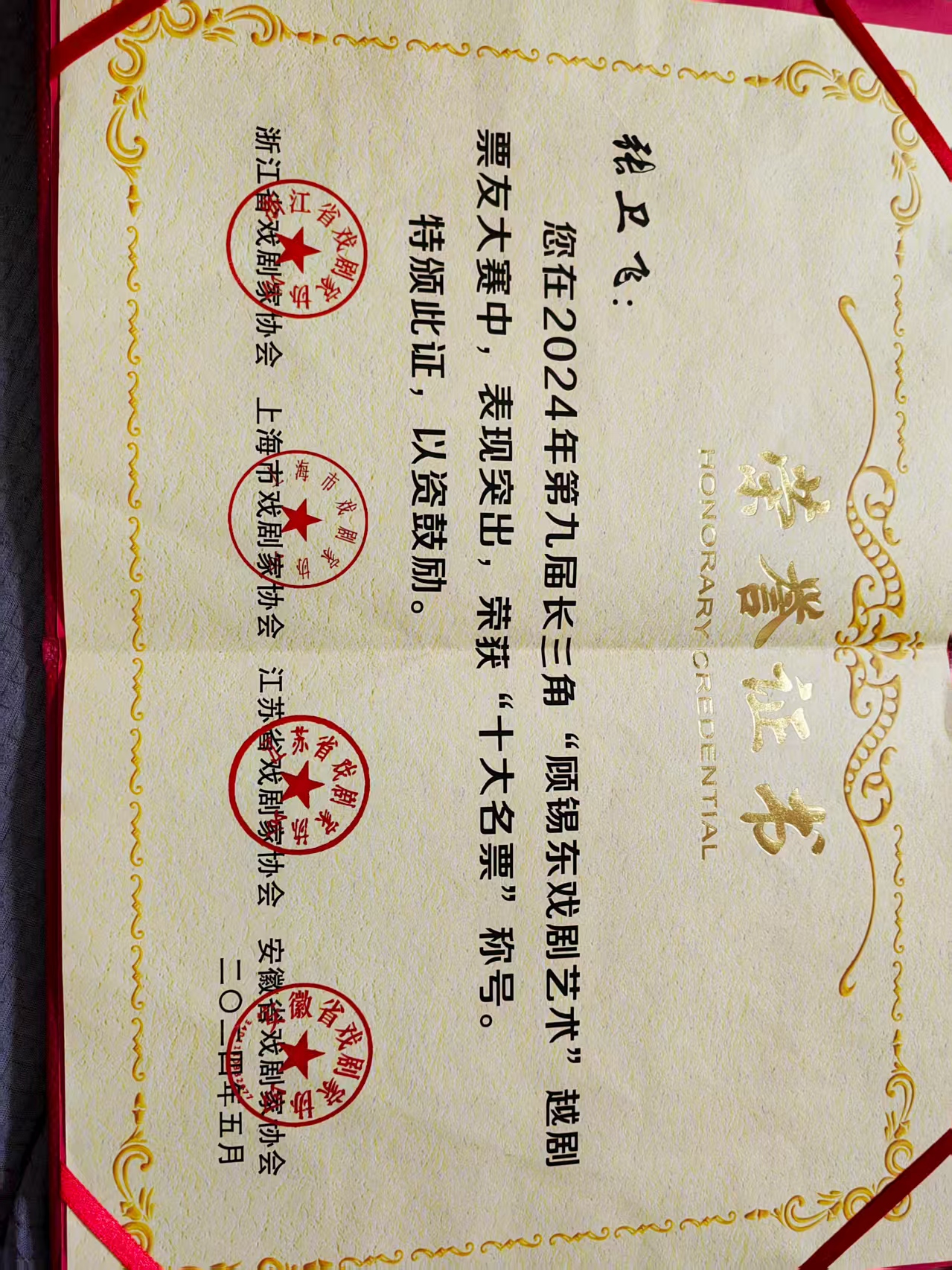 级演职人员或获省级专业奖项荣誉演员:第九届长三角“顾锡东戏剧艺木”越剧票友大赛荣获“十大名票”称号