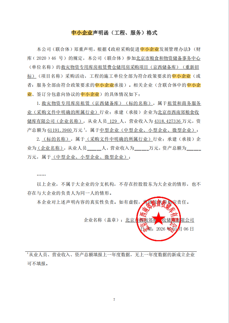 | 北京市西南郊粮食收储库有限公司 | 救灾物资专用库房租赁费仓储用房(京西储备库) | / | * | ***.**万元 | ***.**万元 | / |