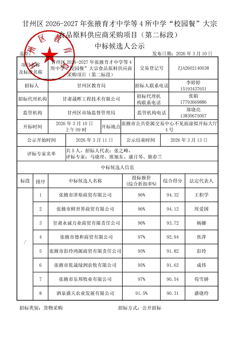[市本级]甘州区2026-2027年张掖育才中学等4所中学“校园餐”大宗食品原料供应商采购项目(第二标段)中标候选人公示[交易结果公示]