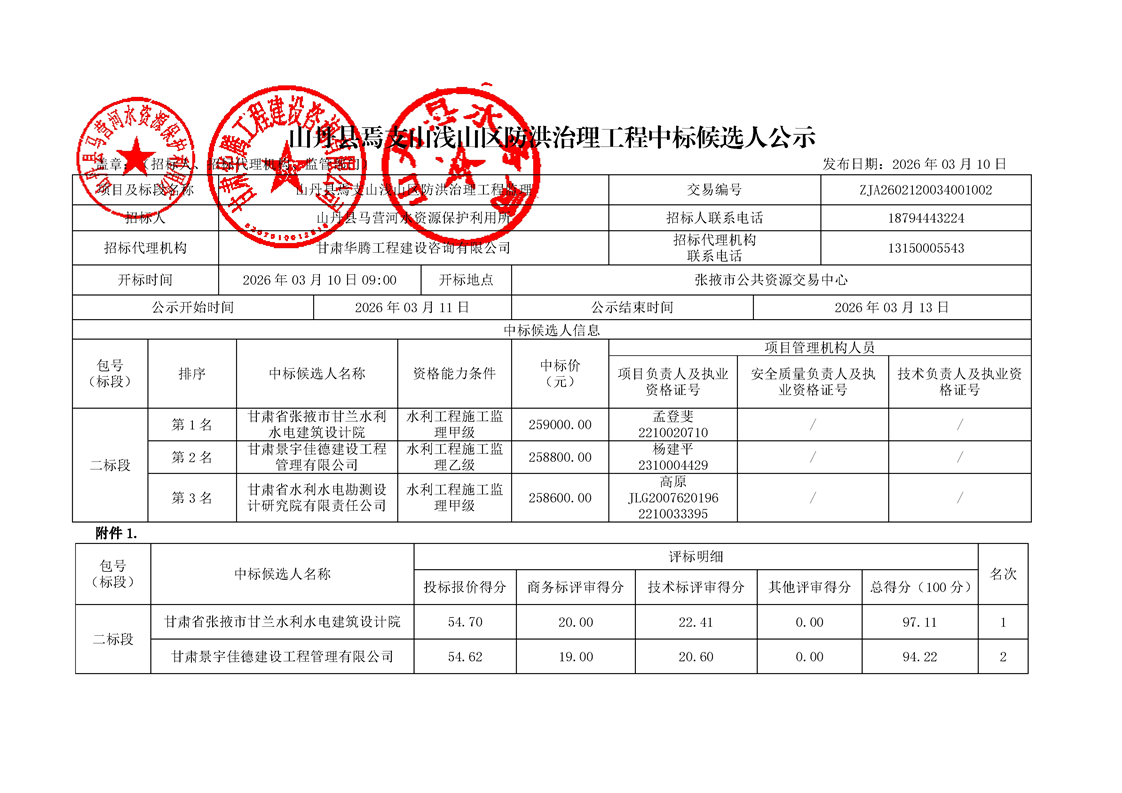 [市本级]山丹县焉支山浅山区防洪治理工程建设监理中标候选人公示[交易结果公示]