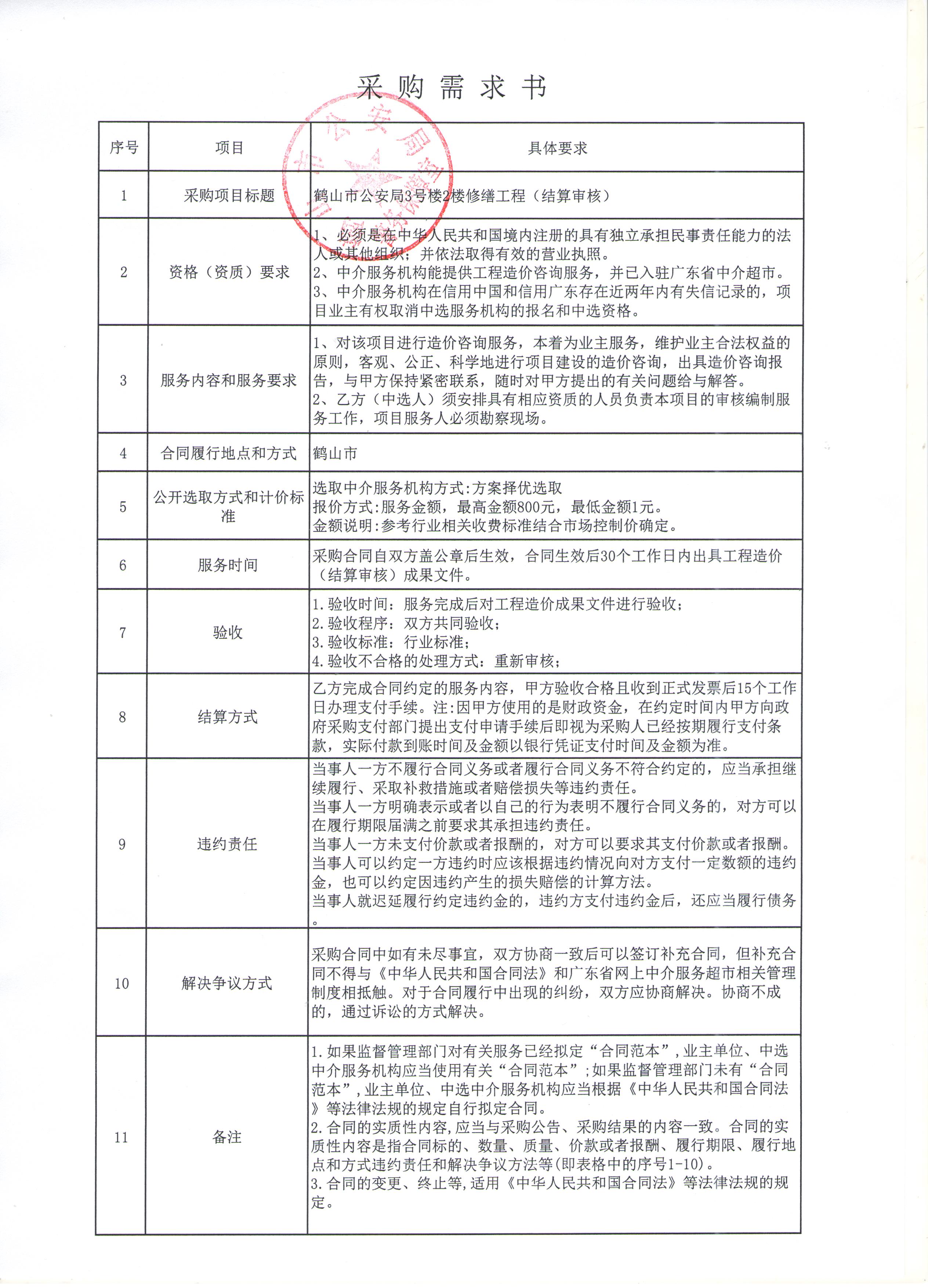 鹤山市公安局3号楼2楼修缮工程(结算审核)采购公告