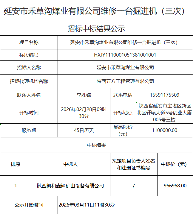 延安市禾草沟煤业有限公司维修一台掘进机(三次)中标结果公示