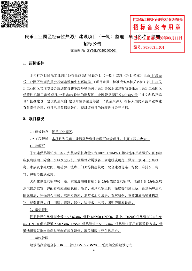 民乐工业园区经营性热源厂建设项目(一期)监理[招标/资审公告]