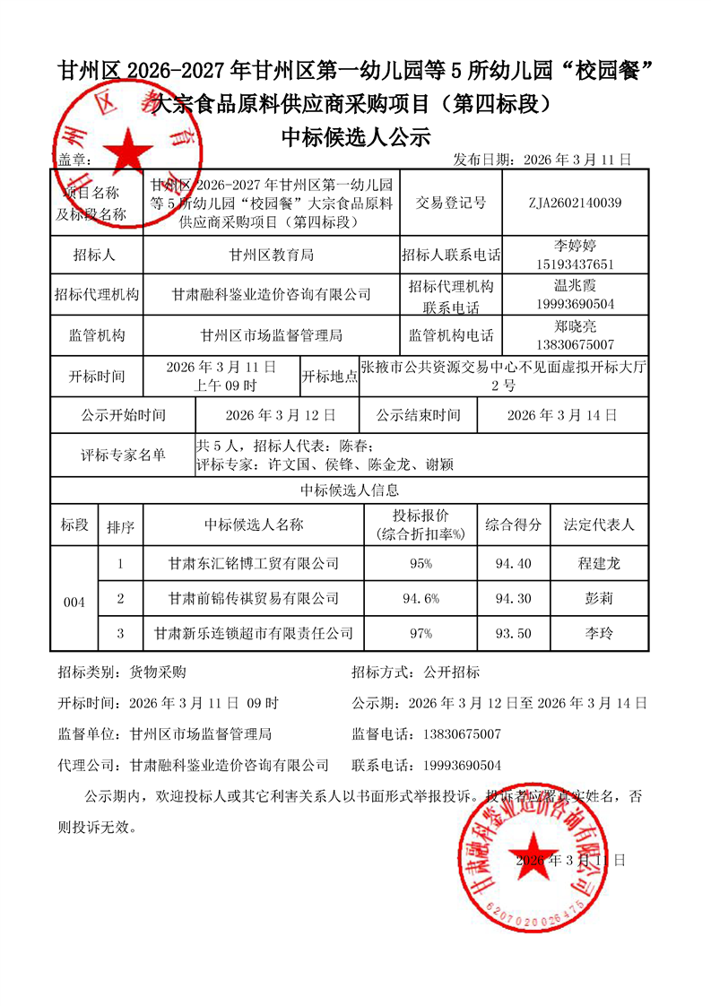 [市本级]甘州区2026-2027年甘州区第一幼儿园等5所幼儿园“校园餐”大宗食品原料供应商采购项目(第四标段)中标候选人公示[交易结果公示]