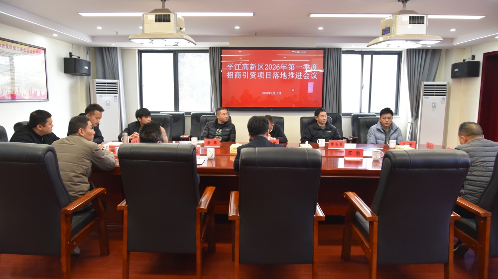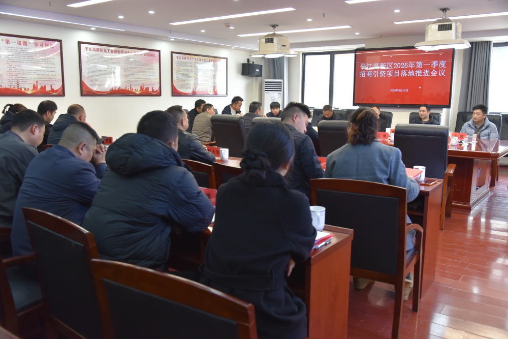 *月**日,平江高新区召开****年第一季度招商引资项目落地推进会议,会议紧凑务实、高效顺畅,一批优质项目落地园区,现场明确服务职责、回应企业诉求,以全链条、一站式、保姆式服务,为项目从签约到投产保驾护航。平江高新区全体在家班子成员及各部门负责人、联企干部、五家签约企业负责人等参加会议。