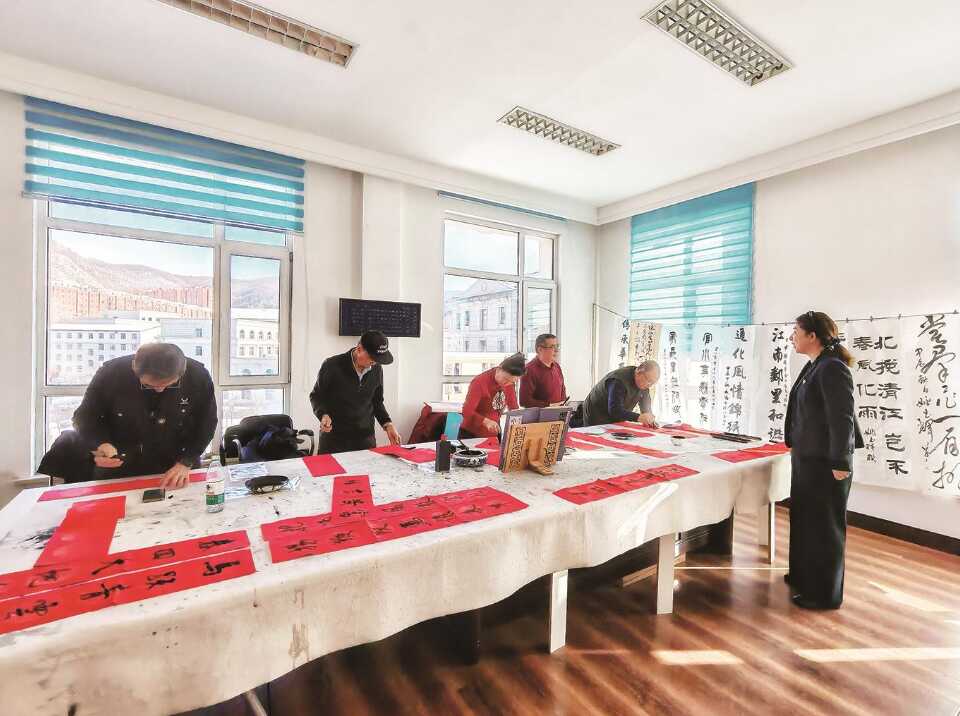 老有所学,老有所乐。新时代文明实践站内,老人们泼墨挥毫,练习书法。