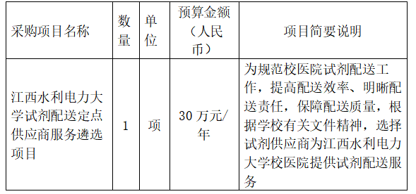 项目名称:江西水利电力大学试剂配送定点供应商遴选项目