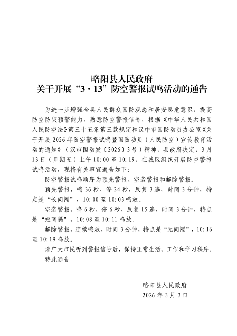 略阳县人民政府关于开展“3·13”防空警报试鸣活动的通告