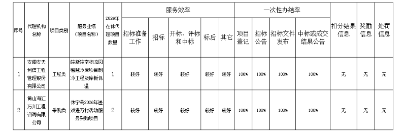 休宁县公共资源交易招标采购代理机构服务质量信息
