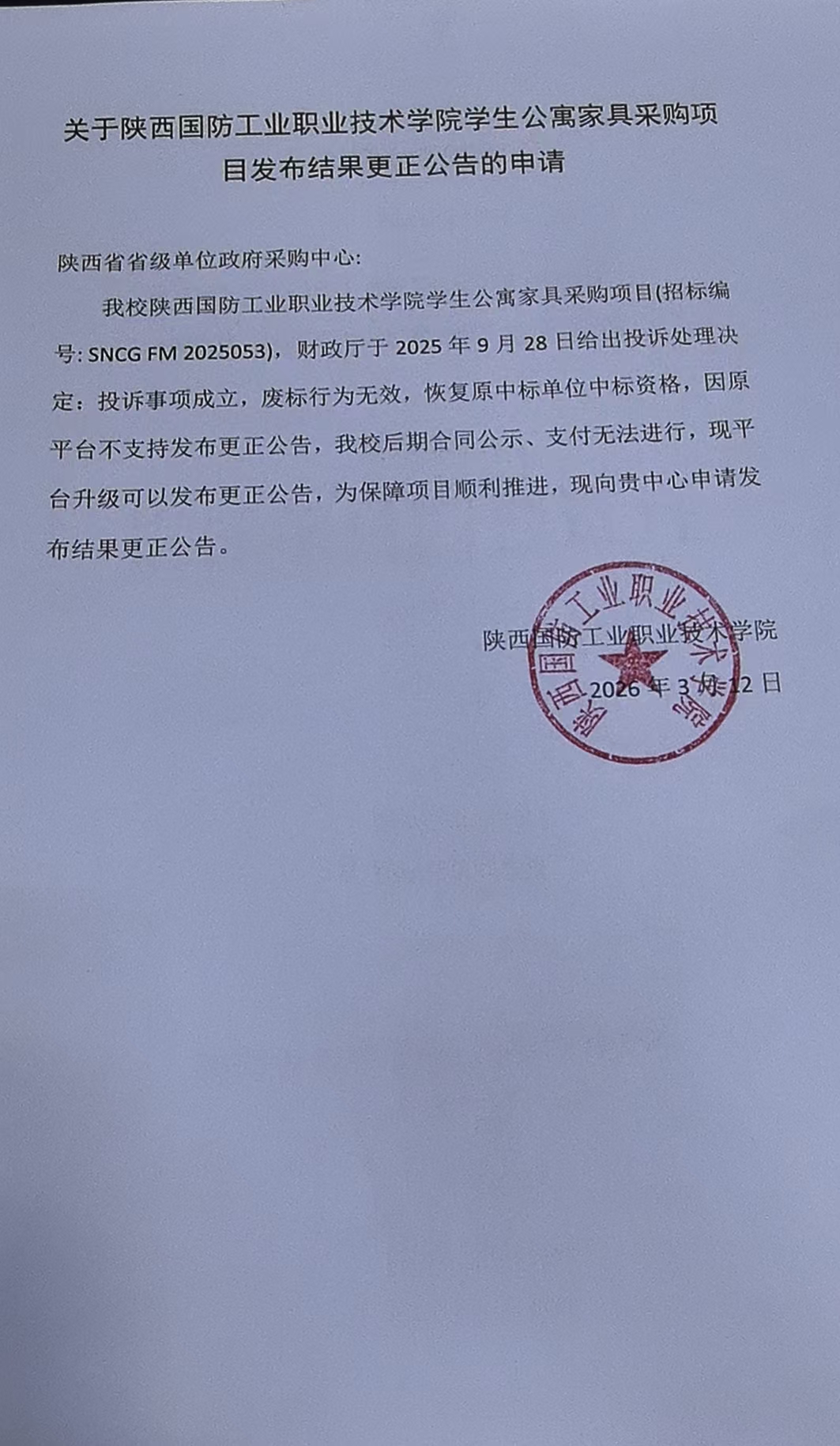陕西国防工业职业技术学院学生公寓家具采购项目结果更正公告(第二次)