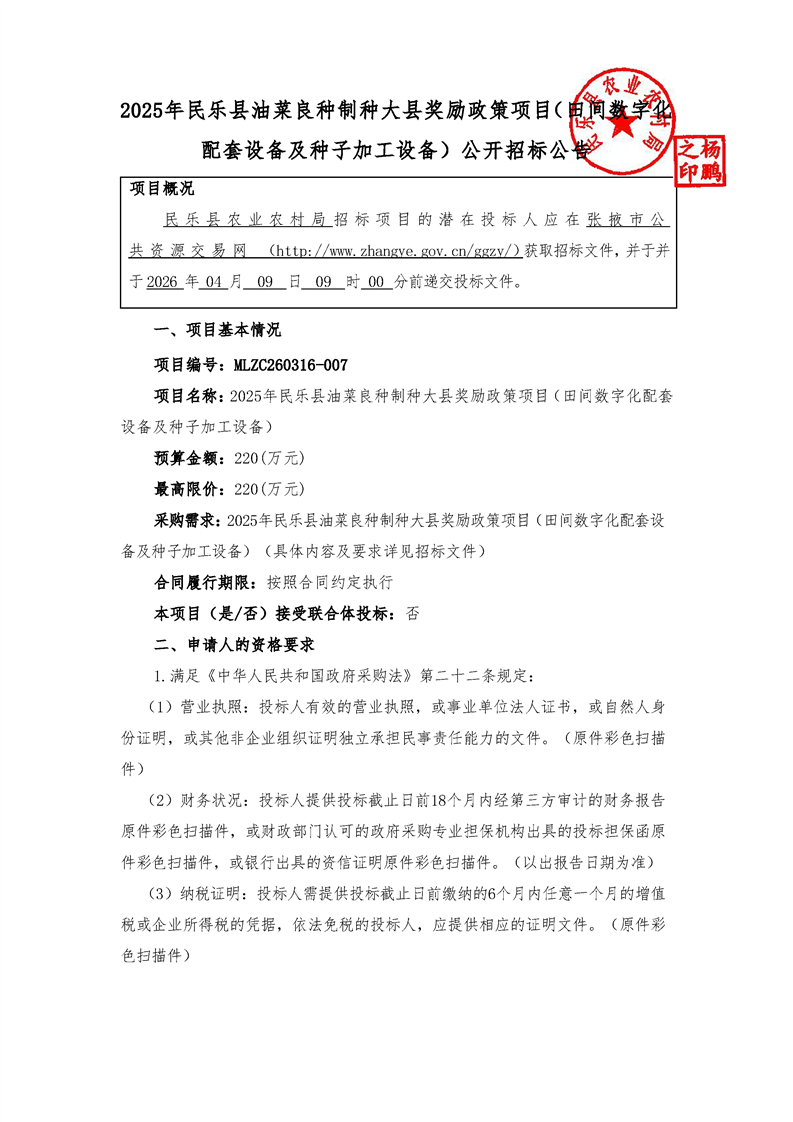 2025年民乐县油菜良种制种大县奖励政策项目(田间数字化配套设备及种子加工设备)招标公告[采购/资审公告]