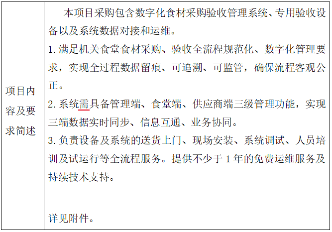 本采购项目包含数字化食材采购验收管理系统、专用验收设备以及系统数据对接和运维。具体需求如下: