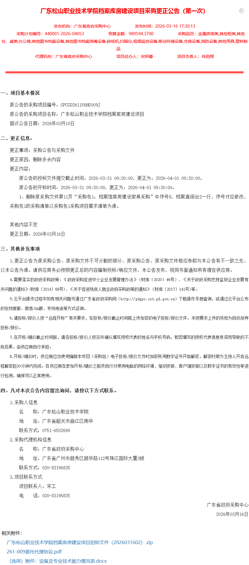 【更正公告】广东松山职业技术学院档案库房建设项目采购更正公告(第一次)