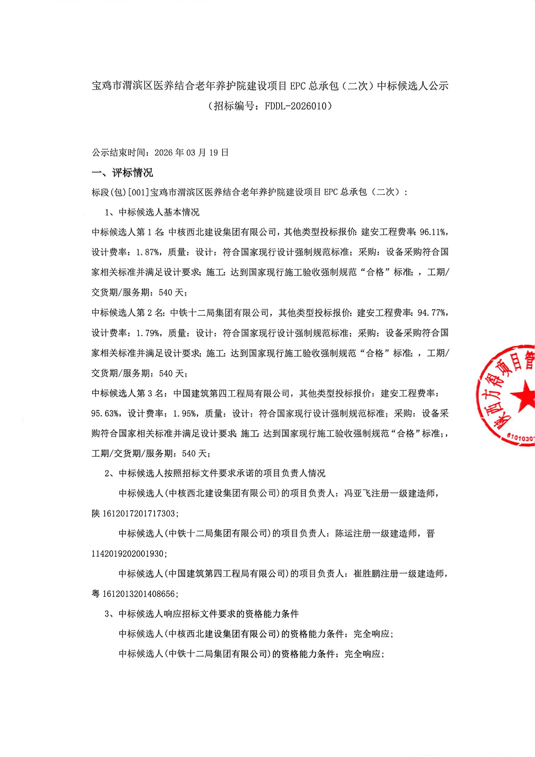 宝鸡市渭滨区医养结合老年养护院建设项目EPC总承包(二次)中标候选人公示