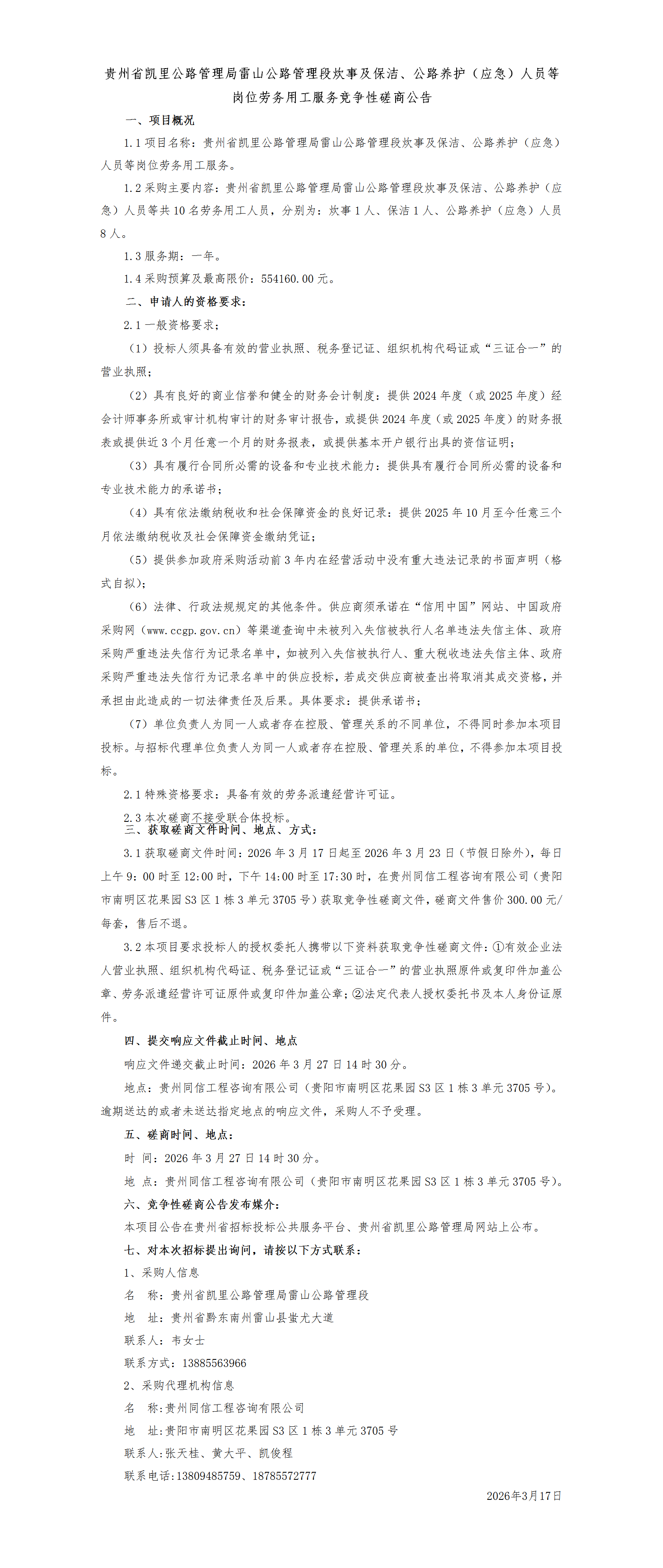 贵州省凯里公路管理局雷山公路管理段炊事及保洁、公路养护(应急)人员等岗位劳务用工服务竞争性磋商公告