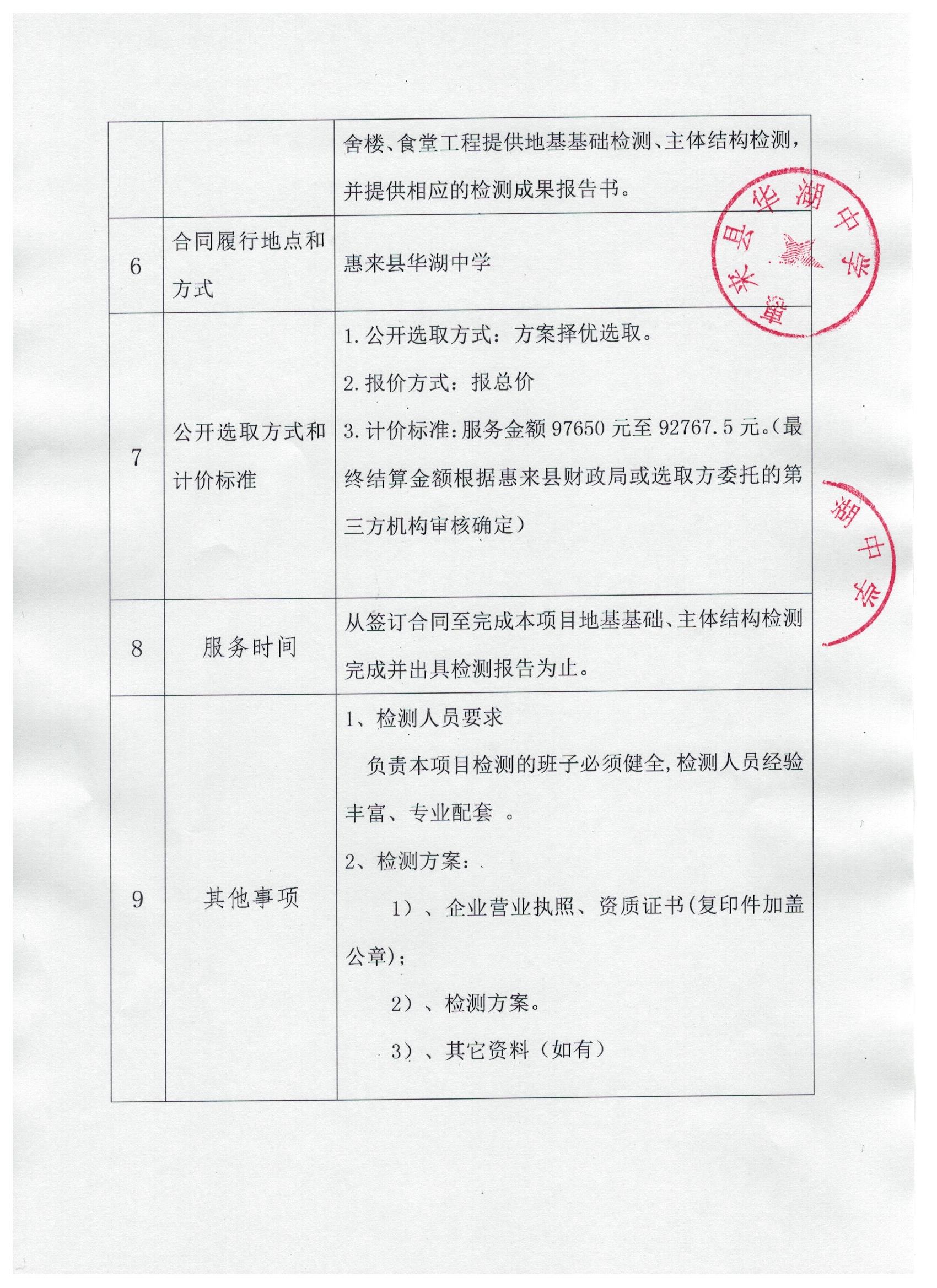 对惠来县华湖中学新建学生宿舍楼、食堂工程提供地基基础检测、主体结构检测,并提供相应的检测成果报告书。(如果本栏目内容与采购需求书不一致,以采购需求书为准)