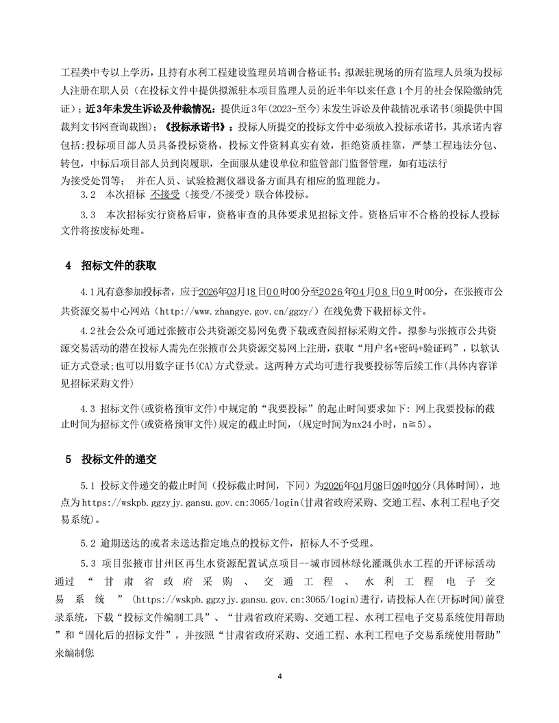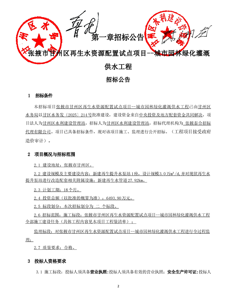 张掖市甘州区再生水资源配置试点项目--城市园林绿化灌溉供水工程招标公告[招标/资审公告]