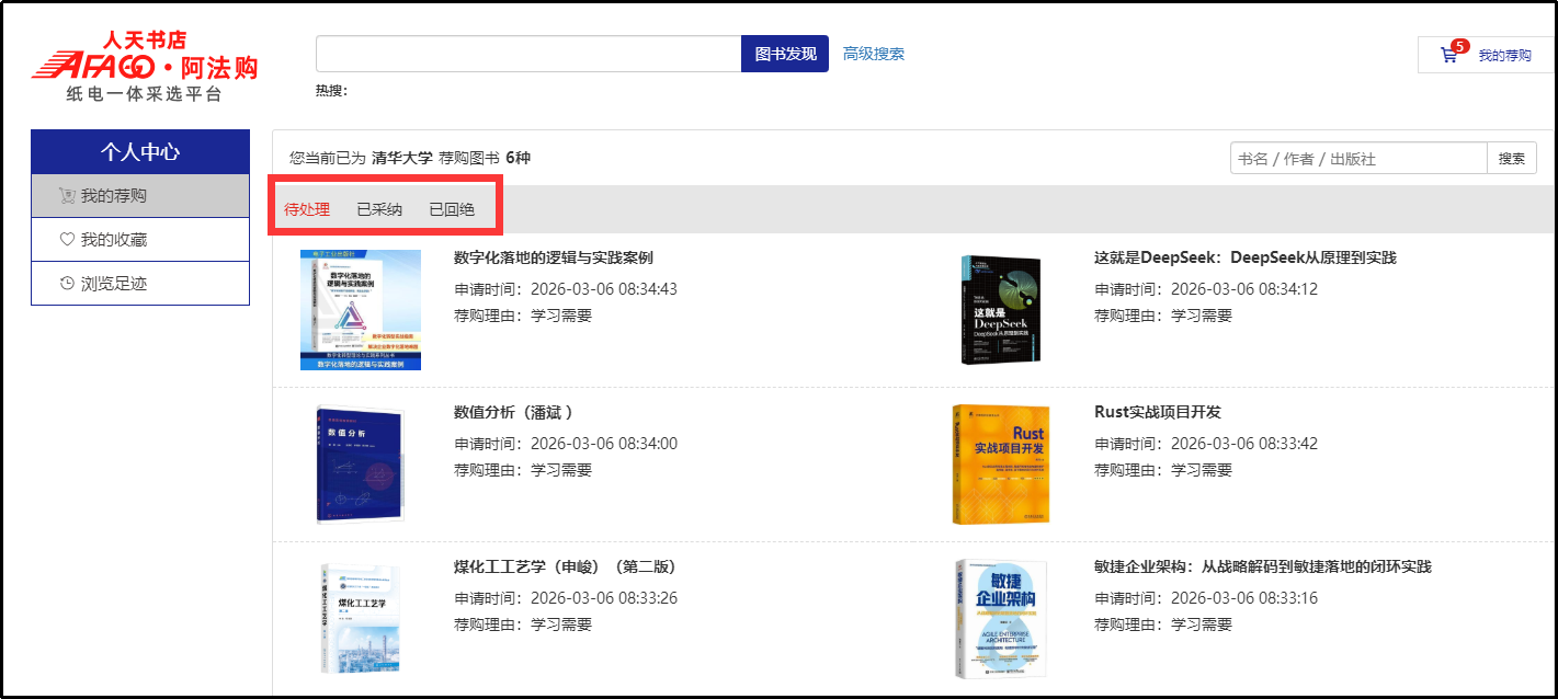 也可以通过我的荐购:【个人中心】→【我的荐购】中可查看到所有的荐购书目及图书馆的采纳情况。